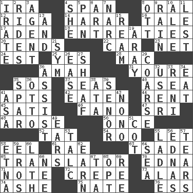 ACROSS 1. Lyricist Gershwin 4. Connect, as a bridge 8. Of the mouth 12. Capital of Latvia 14. Ethiopian city, capital of Harari 16. Story 17. Arabian gulf 18. Pleas 20. Watches over 22. 4-wheeled motor vehicle 23. Fish or hair follower 24. Eastern Standard Time (abbr.) 25. Consenting reply 28. Apple computer (short form) 30. Nursemaid 31. You are 35. Mayday 37. Oceans 40. Toward the sea 41. Tenement units (abbr.) 42. Ingested 44. Monthly bill 45. Suttee (variant) 46. Papal veil 47. Indian title of respect (Mr.) 48. Came up 50. Single time 52. Make lace 54. Friend of Pooh 55. Allow 58. Snakelike fish 61. Actress Charlotte 63. Sadhe (variant) 65. Interpreter 70. Pulitzer Prize-winning author Ferber 71. Observe 72. Streamer paper 73. Having or resembling wings 74. American tennis player Robert 75. Nathan's nickname 76. Double-curved letter DOWN 1. Feeling or showing extreme anger 2. Amusement-park features 3. Rep 4. A female animal or person 5. Baking dish 6. Tate display 7. Drug cop 8. Baseball player Mel 9. Precipitation 10. Toward shelter 11. For fear that 13. Plus 15. 480, 500 or 516 sheets of paper 19. Like ___ of sunshine 21. Symbol (abbr.) 26. Comfort 27. Archer's quiver 29. Unrefined 30. Aid 32. One who makes use of a thing 33. Painter Guido (1575-1642) 34. Consume 35. Practice fight 36. Von Bismarck 38. _ moment's notice (2 wds.) 39. Sir (Sp.) 41. White ___ sheet 43. Words to Nanette 49. Hearing organs 51. Small bed 53. Baby powder 55. Dipping utensil 56. Ferber et al. 57. Rends 58. Inactive volcano in Sicily 59. Greek god of love 60. Thin strip of wood or metal 62. Merit 64. Ocean 66. Born 67. Beverage made from leaves 68. Choose 69. To sift
