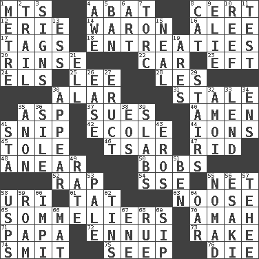 ACROSS 1. Mountains (abbr.) 4. Blind as ____ 8. Foregone conclusion 12. One of the Great Lakes 14. Make _____ (do battle with) 16. Toward shelter 17. Labels 18. Pleas 20. Remove soap 22. Automobile 23. Newt 24. Raised railways 25. Area sheltered from the wind 28. French article 30. Having or resembling wings 31. Showing deterioration from age 35. Cleo's killer 37. Takes to court 40. So be it 41. Sever or remove by pinching or nipping 42. Learning spot: Fr. 44. Charged particles 45. Lacquered or enameled metalware 46. Russian ruler of old 47. To free from 48. Approach 50. Moves up and down 52. Hit sharply and swiftly 54. Compass dir. 55. Fish or hair follower 58. RI univ. 61. Make lace 63. Trap for birds or small mammals 65. Wine waiters 70. Nursemaid 71. Dad 72. World-weariness 73. Libertine 74. Stricken, poetically 75. Ooze 76. Pass on DOWN 1. Distance measurement (Brit.) 2. Lag or linger behind 3. Public displays of written messages 4. Deep reverence 5. Bar 6. Nonscientific branch of learning 7. Torque (variant) 8. Domesticated feline 9. Writer Wiesel 10. Coral ridge 11. Trial 13. Curvy letter 15. Actress Patricia 19. Ancient Greek god of war 21. Pipe bend 26. Relaxation 27. Spew [out] 29. Flight of steps 30. Seem 32. Mine, in Marseilles 33. Grant temporary use of 34. Followers of ems 35. Soon (poet.) 36. Drop; flow; fall 38. Greek goddess of the dawn 39. Thick slices 41. R.R. building 43. Greek god of love 49. Assign a rank or rating to 51. Benjamin's nick name 53. Light colored 55. Wanderer 56. 1973 Nobel Price Winner (Physics) Leo 57. Giggle 58. United States Postal Service (abbr.) 59. Wander aimlessly 60. Body of Kaffir warriors 62. Canisters 64. Boat paddle 66. Floor covering 67. Compass dir. 68. Regret 69. Small drink
