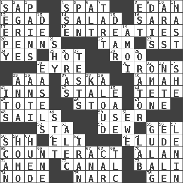 ACROSS 1. Plant excrement 4. Argument over a trivial matter 8. Dutch treat 12. Mild oath 14. Vegetable dish 16. "Two Mules for Sister ____" 17. 4th largest of the Great Lakes 18. Pleas 20. Actor Sean's family 22. Scottish cap 23. Fast jet (abbr.) 24. It is so 25. Being at a high temperature 28. Friend of Pooh 30. Jane of fiction 31. Metal shackles 35. American Automobile Association (abbr.) 37. "____ silly question..." 40. Nanny 41. Restaurants 42. Having lost freshness 44. Wig 45. Lug 46. Portico 47. Single 48. Moves on water 50. One who makes use of a thing 52. R.R. building 54. Morning condensation 55. Set 58. Quiet! 61. Connecticut Ivy Leaguer 63. Dodge 65. Neutralize 70. Actor Alda or Thicke 71. So be it 72. Lessep's creation 73. Indonesian resort city 74. Connecting point 75. Drug cop 76. Commissioned mil. rank DOWN 1. Not well drained, as in land 2. Match 3. Aches 4. Compass dir. 5. Baking dish 6. The first octave above the treble staff 7. Small pie 8. Eastern Standard Time (abbr.) 9. Raised platform 10. Ancient Greek god of war 11. Vertical spar for supporting sails 13. Lair 15. Letter starter 19. Mine, in Marseilles 21. Like a shrinking violet 26. Mouths or openings 27. Trials 29. Speaker 30. Artist's stands 32. Sign of something about to happen 33. Nathan's nickname 34. A female animal or person 35. Small Philippine buffalo 36. Against 38. Krazy ___ of comics 39. Verbally 41. ___ a Wonderful Life 43. Relaxation 49. Proofreading order 51. She-sheep 53. Actor Baldwin 55. POW camp 56. Peak District village in England 57. Soviet premier 1918-24 58. Glance over 59. Like (prefix) 60. Became colored 62. SW Asia republic 64. Experiment locale 66. Compass dir. 67. Santa ___, CA 68. 4-wheeled motor vehicle 69. Affectionate concern, for short