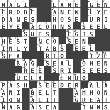 ACROSS 1. Wise men 5. Unable to walk 9. Commissioned military rank (abbr.) 12. Eat (away) 14. Afresh 15. Sodium hydroxide 16. Natives or inhabitants of Denmark 17. Stockings 18. RI univ. 19. Sight organ 20. Oak nuts 23. Sew up the eyelids of hawks and falcons 24. Takes to court 25. The front part of a cuirass 27. Command 30. Non-commissioned officer (abbr.) 32. Elected rep. 33. In an inward manner 34. Bar bills 36. Snakelike fish 38. Ocean 39. _ de Janeiro 40. Ending with capital 43. Paper or plastic container 46. Lick closed 48. Presage 49. To separate or throw off 51. _ Lanka 52. Perceives with the eye 53. Southern CA. univ. 54. Inside; within (prefix) 56. Romantic infatuation 58. Sowing specialist 61. Chicken ___ king 64. Cuckoo 65. Waist strap 66. ID or VA city 68. Electrically charged atom 69. Set down 70. Relatively large 71. Tired old horse 72. Toward the sea 73. Lodging establishments DOWN 1. Ancient Persian 2. Like ___ of sunshine 3. Went 4. Binary compound 5. Cowardly lion portrayer 6. At once, immediately (arch.) 7. Makes clutter 8. She-sheep 9. Cements 10. Jane of fiction 11. Famous astronaut Armstrong 13. Son of Isaac 21. Penny 22. Motion picture awards 23. Trig term 24. Filthy place 26. Turn to the right 27. Part of HMS, perhaps 28. Compass dir. 29. Broad, flat, thick piece 31. Off-Broadway awards 35. Flew 37. Citrus frut 41. Last letter of the English alphabet 42. Followers of ems 44. Bowlike part 45. Set 47. Actor's bit 48. Bear (Spanish) 50. Artist's stands 53. Exploiting 55. To be drawn or hauled along 56. Ache 57. Small Philippine buffalo 59. Writer Wiesel 60. Singer James 61. So be it 62. Grant temporary use of 63. Pismires 65. Sound made by sheep 67. Medical imaging device (abbr.)