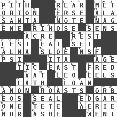 ACROSS 1. Essential or central part 5. Posterior 9. Was introduced to 12. Greek mythologigal hunter 14. Celtic language 15. Chicken ___ king 16. Before Barbara or Clara 17. Observe 18. Tired old horse 19. Compass dir. 20. Full of chinks, cracks, or crevices 23. Elected reps. 24. Land measure 25. Relief 27. For fear that 30. Ingest 32. Put into a specified state 33. _ mater 34. A type of plum 36. Overdraft (abbr.) 38. Air pressure measure (abbr.) 39. Call ___ day 40. Mature 43. Nervous spasm 46. Compass direction 48. Flintstone 49. Large container 51. Lion 52. Snakelike fish 53. Thin strip of wood or metal 54. Rich soil 56. At once, immediately (arch.) 58. Cooks with dry heat, as in an oven 61. Globe 64. Greek goddess of the dawn 65. Lick closed 66. _ Allan Poe 68. Single 69. False hair 70. Nest on high 71. Not either 72. American tennis player Robert 73. Left DOWN 1. Airs 2. SW Asia republic 3. Prong on a fork 4. Being at a high temperature 5. Western Nevada city 6. Greek god of love 7. Michaelmas daisies 8. To separate or throw off 9. French painter Edouard 10. Enthusiasm 11. Labels 13. Drug cop 21. Angers 22. Ear of corn 23. Fast planes 24. _ moment's notice (2 wds.) 26. Car or cant ending 27. Infant locale 28. Raised railways 29. Stricken, poetically 31. "_____ Recall" 35. Artist's stands 37. Conductor's collection 41. Set 42. Begley and Asner 44. _ the terrible 45. Domesticated feline 47. A blast of a horn 48. Opposite of masc. 50. Threesomes 53. Failure 55. At sea 56. A really long time 57. Words to Nanette 59. Pledge 60. Toward shelter 61. Legendary monster 62. Precipitation 63. Cy Young winner Saberhagen 65. R.R. building 67. Morning condensation