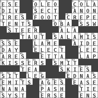ACROSS 1. Compass dir. 4. Butter sub 8. Root beer relative 12. HTML Container Element 13. Religious group 14. Soon (poet.) 15. Angers 17. One third of a yard 18. Streamer paper 19. Portable shelters 21. Chief or king in Benin or Nigeria 23. Compass dir. 24. Navigate 26. In the manner of 28. Drawn tight 30. Deli grouping 34. Compass dir. 37. Unable to walk 39. Assistant 40. 24 hours 41. Choose 43. Area sheltered from the wind 44. Ancient Greek god of war 46. Singer James 47. Pet locale 48. Smoochers 51. Stricken, poetically 54. Afternoon social gathering 55. Atmospheres 58. Be seated 61. Part of a journey 63. Ferber et al. 65. Sends forth 67. Eras 71. Relaxation 72. Grandmother 73. Romantic infatuation 74. Make a knot 75. System (abbr.) 76. Celtic language 77. Followers of ems DOWN 1. Prepare for publication 2. Founders of families 3. Happening 4. Order of Saint Francis (abbr.) 5. Lion 6. Environmental prefix 7. "Beetle Bailey" pooch 8. Auto 9. Washington bills 10. Chops off 11. Afresh 16. Proofreading order 18. Give a ring to 20. Ocean 22. Sound made by sheep 25. Court order 27. Auto club (abbr.) 29. Falsehoods 30. Religious groups 31. Place where flour is made 32. The main thing one is thinking about 33. Ooze 34. Neighbor of Neb. 35. Indian skirt 36. Snake ____ (dice throw) 38. Was introduced to 42. Scottish caps 45. Fast jet (abbr.) 49. Snakelike fish 50. Actress Charlotte 52. Mamie's mate 53. Event that recurs at intervals 56. Maternal 57. Indian antelope 58. Elected reps. 59. "If ____ say so..." 60. Airtight sealed metal containers 62. Open wide 64. Perceives with the eye 66. Make lace 68. Slender fish 69. Double-curved letter 70. A female animal or person