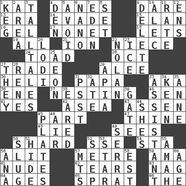 ACROSS 1. Krazy ___ of comics 4. Natives or inhabitants of Denmark 9. Have the gumption 13. Epoch 14. Elude 15. Style 16. Set 17. Music written for nine 18. Allows 19. 100% 21. Electrically charged atom 22. Sibling's daughter 24. Frog relative 26. Sep. follower 27. Exchange 29. Toward shelter 30. Sun: prefix 31. Dad 33. Alias (abbr.) 36. Compass dir. 37. Inhabiting a nest 40. Elected rep. 41. It is so 42. Toward the sea 43. NE Netherlands city 45. Role in a play 47. One or ones belonging to thee 48. Whopper 49. Observes 50. Pottery fragment 52. Compass dir. 54. R.R. building 56. Set down 57. Distance measurement (Brit.) 59. Nursemaid (var.) 61. Unadorned 62. Lacerates 63. Tired old horse 64. Ripens 65. Small fatty European fish 66. Definite Article DOWN 1. Cask 2. Type of rug 3. Baron Munchausen's specialties 4. Lair 5. Prevent from happening 6. Billionth: prefix 7. Paradise 8. Put into a specified state 9. Erase 10. Actor Baldwin 11. Pace 12. Followers of ems 20. Farming town in central California 22. Pitcher Ryan 23. Frozen water 25. Period of immesurable duration 27. Those things 28. French philosopher Descartes 29. Capital of Western Samoa 31. Inconspicuous attention getter 32. Had dinner 33. Helper 34. Peachy ____! 35. Singer Murray 38. Having ears or earlike features 39. Yard entry 44. "______ My Girl" (Turtles hit) 45. Food holders 46. Atmosphere 49. Spanish missionary in California 50. A hard, heavy blow 51. Flintstone garb 52. Ooze 53. Play the lead 55. Nursemaid 56. Santa ___, CA 57. Mountains (abbr.) 58. Eastern Standard Time (abbr.) 60. Grow older