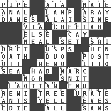 ACROSS 1. Corncob 5. "One Day ___ Time" 8. Nathan's nickname 12. Of or related to the anus 13. Desk light 15. Like ___ of sunshine 16. Natives or inhabitants of Denmark 18. Jai ____ 19. Trig term 20. By way of 22. Leopard's kin 24. Otherwise 26. Island 27. Anneal 28. Put into a specified state 29. Indian title of respect (Mr.) 32. Cy Young winner Saberhagen 35. United States Postal Service (abbr.) 37. Layer 38. Pledge 39. Superhero pair 40. Mail 41. Baseball player Mel 42. Former U.S. Attorney General Janet 43. "Tell ____ the Marines!" 44. Ocean 45. Possessed 46. Drug cop 49. And not 50. In a ____ (agitated or irritated) 51. Of or relating to Laos or its people 55. Australian flightless bird 56. Painter Guido (1575-1642) 57. Family _ (genealogy) 59. A salt of uric acid 63. Pismires 64. Shout 65. Nights before holidays 66. Singer Brickell 67. Everything 68. Without DOWN 1. Groovy apt. 2. _ tizzy (2 wds.) 3. Baking dish 4. Veterans Day date 5. In the manner of 6. Baby powder 7. Nursemaid 8. Difficult 9. Roberta Peters solo 10. Hyperbolic tangent 11. Sight organ 14. Parts 17. Filth; sediment 21. White ___ sheet 23. Erode 25. Evaded 28. Soup utensils 29. Attempt 30. Take ten 31. To the inside or interior of 32. Scornful sounds 33. Pace 34. Singer James 36. Player for Phoenix 40. Photos 42. Noteworthy scarcity 45. Being at a high temperature 47. A saturated hydrocarbon 48. Tall New Zealand timber tree 49. Annoying sound 51. Grant temporary use of 52. Against 53. Length times width 54. 1994 drama film starring Jodie Foster 56. Actress Charlotte 58. Pipe bend 60. Actress Gardner 61. Nine, plus one 62. Curvy letter