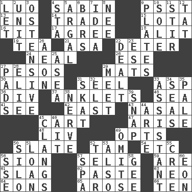 ACROSS 1. Nilotic language 4. Unit of acoustic absorption 9. Inconspicuous attention getter 13. Followers of ems 14. Buy and sell 15. Globular water bottle used in Asia 16. Teat (slang) 17. Match 18. Set down 19. Afternoon social gathering 21. White ___ sheet 22. Prevent from occurring 24. Actress Patricia 26. Compass dir. 27. Mexican monetary units 29. Floor coverings 30. Place in a line 31. Sew up the eyelids of hawks and falcons 33. Viper 36. HTML Container Element 37. Short socks 40. Ocean 41. Observe 42. Compass direction 43. Rhinal 45. Haul 47. Originate 48. 54 in ancient Rome 49. Elects 50. Schedule 52. Scottish cap 54. And so on (abbr.) 56. The Jewish people; Israel 57. Major League Baseball Commissioner Bud 59. "We ___ not amused" (Victoria) 61. Volcanic refuse 62. Thick mixture 63. Modern: prefix 64. Immeasurably long periods of time 65. Came up 66. Nine, plus one DOWN 1. Allow 2. A single undivided whole 3. Clearly or manifestly demonstrative 4. R.R. building 5. Therefore, facetiously 6. Drinking establishments 7. The content of cognition 8. Born 9. Food holders 10. Flatfish 11. Commotion 12. Make lace 20. Period of immesurable duration 22. Started a card game 23. Eastern Standard Time (abbr.) 25. Toward the sea 27. Writing tablets 28. Writer Wiesel 29. Confront 31. Three-handed card game 32. Raised railways 33. Aide 34. Oceans 35. Diluted with white 38. Boldness 39. Fastener 44. Johnson of "Laugh-In" 45. Gives out a loud, resonant sound 46. Small island 49. Leaves out 50. Grain storage tower 51. Grant temporary use of 52. Lacerate 53. In addition 55. Algonquian 56. Compass dir. 57. Health resort 58. Unit of force equal to gravity 60. A really long time
