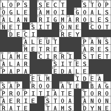 ACROSS 1. Chops off 5. Religious group 9. Cease 13. Stare at amorously 14. Mine, in Marseilles 15. Purposes of endeavors 16. Actor Alda or Thicke 17. Complicated, petty procedures 19. Remaining after all deductions 20. Be seated 21. Single 22. Small bed 23. Tenth: prefix 25. Marina Del _, California 26. Eskimo relative 30. Zero-star reviews 34. Distance measurement (Brit.) 35. Ancient Greek god of war 36. Unable to walk 39. High-altitude cloud 42. Proofreading order 43. Having or resembling wings 44. Locates 46. Dad 47. Peak District village in England 48. Shade tree 51. The main thing one is thinking about 54. Plant excrement 57. Friend of Pooh 58. Had dinner 60. Paper or plastic container 62. Conciliate 65. "Corrida" creature 66. Nest on high 67. Portico 68. Soon (poet.) 69. Assign a rank or rating to 70. Scottish caps 71. Unit of force DOWN 1. Grant temporary use of 2. Stared at amorously 3. Food holder 4. Elected rep. 5. Indian skirt 6. Give off 7. Gear tooth 8. Southeast Indonesia island 9. "Barney Miller" actor Jack 10. Baby powder 11. Margarine 12. Inconspicuous attention getter 15. Jennifer or Joel 18. One (Scot) 20. Filth; sediment 24. Device for capturing images 27. And so on (abbr.) 28. RI univ. 29. Laconic 30. Went by 31. Nonscientific branch of learning 32. Born 33. Fast jet (abbr.) 36. Infant locale 37. Chicken ___ king 38. Atlas unit 40. To free from 41. Call ___ day 45. Writer Wiesel 48. 4th largest of the Great Lakes 49. Car dealer's back yard 50. Damp 52. Dark wood 53. Composer Copland 54. Practice fight 55. Length times width 56. Left side of a ship or aircraft 58. Smallest unit of an element 59. Beverages made from leaves 61. Went 63. Sliced dessert 64. _ moment's notice (2 wds.) 65. Small amount or degree