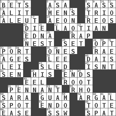 ACROSS 1. Stakes 5. White ___ sheet 8. Backtalk 12. Set down 13. Not women's 15. Musical group of three 16. Eskimo relative 18. Period of immesurable duration 19. Vintage cars 20. Pass on 22. Of or relating to Laos or its people 24. Pulitzer Prize-winning author Ferber 26. Reproach for some lapse or misdeed 27. Egg locale 28. Put into a specified state 29. Elect 32. Left side of a ship or aircraft 35. Washington bills 37. Actress Charlotte 38. Eons 39. Area sheltered from the wind 40. Raised platform 41. Luau accessory 42. Downhill vehicle 43. Is not 44. Elected rep. 45. Part of HMS, perhaps 46. Conclusions 49. Snakelike fish 50. Carrot, for example 51. Pre-World Series prize 55. 17th letter of the Greek alphabet 56. "Two Mules for Sister ____" 57. Island territory of the United States 59. Therefore, facetiously 63. Blemish 64. Inside; within (prefix) 65. Lug 66. Comfort 67. Compass dir. 68. Argument over a trivial matter DOWN 1. Sound made by sheep 2. Pipe bend 3. Make a knot 4. SAT takers 5. Housemaid (var.) 6. Stitch closed the eyes of (a falcon) 7. Small Philippine buffalo 8. Long narrow piece of something 9. Type of rug 10. The Jewish people; Israel 11. Mayday 14. Sounds asleep 17. Periodic rise and fall of the sea level 21. Followers of ems 23. Make lace 25. Ringlike coral islands and reefs 28. Sowing specialist 29. Mouths or openings 30. Ache 31. Trial 32. Friends 33. Double curve, resembling the letter S 34. It's straight from the horse's mouth 36. Born 40. What propaganda does 42. Fodder prepared in a silo 45. Layer 47. And not 48. Capital of the state of Qatar 49. Maternal 51. Dad 52. Greek god of love 53. Religious women 54. Bits 56. Compass dir. 58. Cut the grass 60. Grand Old Party 61. _ moment's notice (2 wds.) 62. Allow