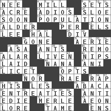 ACROSS 1. Born 4. Place where flour is made 8. Arranges properly for use 12. 43,560 square feet 14. Goodbye (Sp.) 16. A type of plum 17. Within a short period 18. Census information 20. Tree or shrub in the Birch family 22. For each 23. Raised railways 24. Area sheltered from the wind 25. Actor Linden 28. HTML Container Element 30. Went 31. Nest on high 35. White ___ sheet 37. Pismires 40. San ____ (Riviera town) 41. Having or resembling wings 42. Make or become more lively 44. Pinches, bites 45. Put down 46. Nanny 47. Black tropical American cuckoo 48. It is permitted: Lat. 50. Chooses 52. Not either 54. Actress Charlotte 55. Reproach for some lapse or misdeed 58. Part of HMS, perhaps 61. French article 63. Phillipine bananalike plant 65. Pleas 70. Against 71. Singer Brickell 72. Haggard of country music 73. A really long time 74. Old wives' tales, e.g. 75. Docile 76. Followers of ems DOWN 1. Rhinal 2. Learning spot: Fr. 3. Eat (away) 4. Atlas unit 5. Wedding promise 6. Mouth edge 7. Central Nebraska county 8. Fast jet (abbr.) 9. Writer Wiesel 10. Utensil 11. Elected reps. 13. Compass dir. 15. Downhill vehicle 19. Roberta Peters solo 21. 17th letter of the Greek alphabet 26. Of or related to the anus 27. Soviet premier 1918-24 29. Actresses Bloom and Felton 30. Place where plants grow 32. It's straight from the horse's mouth 33. Body of Kaffir warriors 34. Greek goddess of the dawn 35. Mountain range southwest of Kyrgyzstan 36. Ketch in the Levant 38. Federal power corp. 39. Sir (Sp.) 41. 100% 43. California wine valley 49. Lacquered or enameled metalware 51. Afternoon social gathering 53. 480, 500 or 516 sheets of paper 55. Indian princess (variant) 56. NE Massachussets city 57. Aches 58. The bottom of a shoe or boot 59. Southeast Asian peninsula 60. Commotion 62. Proofreading order 64. Sound made by sheep 66. To riddle 67. Lyricist Gershwin 68. Shade tree 69. Observe