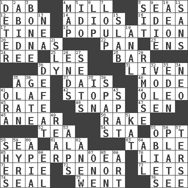 ACROSS 1. Pat or tap gently 4. Place where flour is made 8. Oceans 12. Inky black, to poets 14. Goodbye (Sp.) 16. It may be bright or harebrained 17. Prong on a fork 18. Census information 20. Ferber et al. 22. Baking dish 23. Followers of ems 24. To separate or throw off 25. French article 28. Drinking establishment 30. Centimeter-gram-second unit of force 31. Make or become more lively 35. Grow older 37. Raised platform 40. Method 41. Norwegian king 42. Halts 44. Margarine 45. Assign a rank or rating to 46. Fastener 47. Elected rep. 48. Approach 50. Immoral or dissolute person 52. Beverage made from leaves 54. R.R. building 55. Elect 58. Ocean 61. According to 63. Eating place 65. Abnormally rapid or deep breathing 70. One who doesn't tell the truth 71. 4th largest of the Great Lakes 72. Sir (Sp.) 73. Allows 74. Lick closed 75. Left 76. Perceive with the eye DOWN 1. Prevent from occurring 2. Stay 3. Maid-servant 4. Atlas unit 5. Wedding promise 6. Mouth edge 7. Central Nebraska county 8. Be seated 9. Singer Brickell 10. Period of immesurable duration 11. Without 13. Teachers' org. 15. Thick slice 19. Of or related to the anus 21. Stealthy 26. Conclusions 27. Theater features 29. Full of chinks, cracks, or crevices 30. Outscore 32. Grand slam 33. Locale of original sin 34. Modern: prefix 35. Actor Alda or Thicke 36. Yard entry 38. Electrically charged atom 39. Practice fights 41. Mouth or opening 43. Argument over a trivial matter 49. Posterior 51. Krazy ___ of comics 53. High mountains 55. Off-Broadway awards 56. Food holder 57. Laconic 58. "______ My Girl" (Turtles hit) 59. Jane of fiction 60. Capital of Western Samoa 62. Afresh 64. Everything 66. Snakelike fish 67. Single 68. A really long time 69. Nonscientific branch of learning
