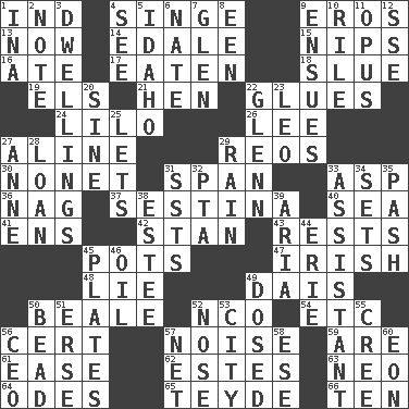 ACROSS 1. Working for oneself (abbr.) 4. Scorch 9. Greek god of love 13. At this time 14. Peak District village in England 15. Cuts off 16. Had dinner 17. Consumed 18. Change direction abruptly 19. Raised railways 21. Layer 22. Adhesives 24. _ and Stitch 26. Area sheltered from the wind 27. Place in a line 29. Vintage cars 30. Music written for nine 31. Connect, as a bridge 33. Cleo's killer 36. Tired old horse 37. French poetic form 40. Ocean 41. Followers of ems 42. Comedian Laurel of Laurel & Hardy 43. Musical pauses 45. Plant holders 47. From or relating to Ireland 48. Untruth 49. Raised platform 50. Calif. Air Force Base 52. Non-commissioned officer (abbr.) 54. And so on (abbr.) 56. Sure thing 57. Annoying sound 59. "We ___ not amused" (Victoria) 61. Relaxation 62. _____ Park, CO 63. Modern: prefix 64. Lyric poems 65. Miss Universe 1986, Barbara Palacios _ 66. Nine, plus one DOWN 1. _ tizzy (2 wds.) 2. Short letter 3. Homes 4. Perceive with the eye 5. Potato state 6. Nathan's nickname 7. Small, secluded valley 8. Car or cant ending 9. Follows as a consequence or result 10. Cause heat under the collar 11. Musical composition 12. Compass dir. 20. Trig term 22. American astronaut and politician John 23. Lion 25. Allows 27. Singer Murray 28. Grant temporary use of 29. Water falling in drops from the sky 31. Fast planes 32. Parent Teacher Association (abbr.) 33. Helper 34. Puts into a specified state 35. Romantic infatuation 38. First name in cosmetics 39. Roberta Peters solo 44. One of the Great Lakes 45. Food holders 46. Petroleum 49. Administered medicine 50. Necklace unit 51. Celtic language 52. Sense of smell 53. Municipality 55. Algonquian 56. Corporate head (abbr.) 57. Fish or hair follower 58. Compass dir. 60. A really long time