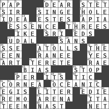 ACROSS 1. Infant food 4. Letter starter 8. Proofreading order 12. Title for a knight 13. Burn superficially 14. Hollow 15. It may be bright or harebrained 17. _____ Park, CO 18. Capital of Western Samoa 19. Gist 21. Threesomes 23. Mamie's husband 24. Indian title of respect (Mr.) 26. Begley and Asner 27. Allodial 28. Without 30. Compass dir. 31. Ringlike coral islands and reefs 34. Definite Article 37. Car or cant ending 38. The wife of a rajah (variant) 39. Consenting reply 40. Tate display 41. Cigar-shaped 42. Actress Charlotte 43. Prejudice 44. Halt 46. For each 47. It is 50. Nervous spasm 51. Pupil covering 54. Pertaining to the sea 57. Armor plate that protects the chest 58. 61 cubic inches 60. Singer Brickell 62. San ____ (Riviera town) 63. Sports stadium 64. Call ___ day 65. Adolescent 66. Political cartoonist Thomas 67. Fish or hair follower DOWN 1. 23rd letter of the Greek alphabet 2. Helper 3. Elected leader of a country 4. Plates 5. Keyboard key 6. Personal question 7. Respite 8. Broken pieces 9. Drinks excessively 10. Writer Wiesel 11. Afternoon social gatherings 13. Elected rep. 16. "____ silly question..." 20. Snakelike fish 22. Coop moms 25. Small island 27. One who uses or employs something 29. Toward shelter 30. Ocean 31. Length times width 32. Tarsus (plural) 33. Single 34. Polypeptide antibiotic 35. Pile 36. Compass dir. 41. Become fatigued 43. Gillaume's butler role 44. R.R. building 45. Prong on a fork 46. First class 48. Lugs 49. Aroma 51. Certainty 52. Double curve, resembling the letter S 53. Actor Alda or Thicke 55. Period 56. Quote 59. Lyricist Gershwin 61. Consume