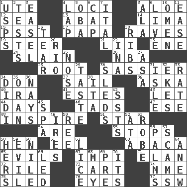 ACROSS 1. Shoshoni 4. Venues 8. _ vera 12. Ocean 13. Blind as ____ 14. Pale green bean 15. Inconspicuous attention getter 17. Dad 18. All-night dance parties 19. Navigate 21. Cards in a Roman deck? 23. Compass dir. 24. Killed 26. Basketball assoc. 28. Carrot, for example 30. More lively and spirited 34. Spanish title 37. Move on water 39. "____ silly question..." 40. Lyricist Gershwin 41. _____ Park, CO 43. Allow 44. 24-hour periods 46. Small amounts or degrees 47. Compass dir. 48. Heighten or intensify 51. Play the lead 54. "We ___ not amused" (Victoria) 55. Discontinues 58. Layer 61. Snakelike fish 63. Phillipine bananalike plant 65. Vices 67. Body of Kaffir warriors 71. Flair 72. Cause heat under the collar 73. Haul 74. Madame (abbr.) 75. Downhill vehicle 76. Snake ____ (dice throw) 77. Compass dir. DOWN 1. United States Postal Service (abbr.) 2. Trials 3. Artist's stand 4. Pet locale 5. Chief or king in Benin or Nigeria 6. Head covering 7. Slanted text style (abbr.) 8. According to 9. Not recorded 10. Sign of things to come 11. Comfort 16. Separate forcefully 18. Teases 20. _ de Janeiro 22. _ tizzy (2 wds.) 25. Characteristic smell of wine 27. White ___ sheet 29. Clothes sense 30. Bobsleighs 31. Capri or Wight 32. Supplements with great effort 33. Pace 34. "You Light Up My Life" star Conn 35. Northwest Algerian city 36. Negative votes 38. Call ___ day 42. Fast planes 45. Health resort 49. Angers 50. To separate or throw off 52. "One Day ___ Time" 53. Loose flowing garment 56. Insides of hands 57. Fraudulent business schemes 58. Possessive pronoun 59. Morally bad or wrong 60. Mediterranean tributary 62. Louse (plural) 64. Afresh 66. Directed 68. Can I? 69. Before (prefix) 70. It is