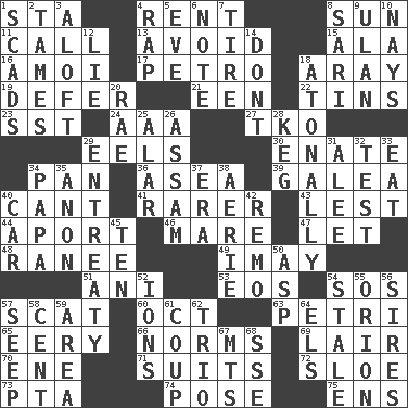 ACROSS 1. R.R. building 4. Monthly bill 8. Player for Phoenix 11. Give a ring to 13. Prevent from happening 15. According to 16. Mine, in Marseilles 17. Stone: prefix 18. Like ___ of sunshine 19. Postpone 21. Car or cant ending 22. Airtight sealed metal containers 23. Fast jet (abbr.) 24. Auto club (abbr.) 27. Ring climax 29. Snakelike fish 30. Maternal 34. Baking dish 36. Toward the sea 39. An organ shaped like a helmet 40. Patter 41. More uncommon 43. For fear that 44. To the left, to Queeg 46. Female horse 47. Allow 48. The wife of a rajah (variant) 49. "If ____ say so..." 51. Black tropical American cuckoo 53. Greek goddess of the dawn 54. Mayday 57. Scram! 60. Sep. follower 63. _ dish (used to culture cells) 65. Suggestive of the supernatural 66. Typical models 69. Den 70. Compass dir. 71. Costumes for special activities 72. _ gin 73. Parent Teacher Association (abbr.) 74. Airs 75. Followers of ems DOWN 1. Loads 2. Domesticates 3. At or to great height 4. Hit sharply and swiftly 5. Night before a holiday 6. Musical sound 7. Become fatigued 8. Indian skirt 9. ____ Bator, Mongolia 10. Negative votes 12. Untruth 14. Do not 18. Lacking a tonal center or key 20. Actress Charlotte 25. Having or resembling wings 26. Indian state 28. Cask 29. Plea 31. Toward shelter 32. Trial 33. Erode 34. Dad 35. Soon (poet.) 37. Epoch 38. Nest on high 40. Auto 42. San ____ (Riviera town) 45. Nine, plus one 50. Cleo's killer 52. Charged particles 54. Showing deterioration from age 55. Constellation of myth 56. Male parents of animals 57. Ooze 58. Penny 59. Length times width 61. Clever action or accomplishment 62. Musical group of three 64. Raised railways 67. Mountains (abbr.) 68. Compass dir.