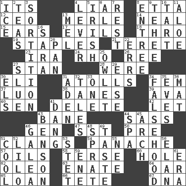ACROSS 1. ___ a Wonderful Life 4. One who doesn't tell the truth 8. Singer James 12. Corporate head (abbr.) 13. Haggard of country music 14. Actress Patricia 15. Hearing organs 17. Vices 18. Through, poetically 19. Paper fasteners 21. Cigar-shaped 23. Retirement account (abbr.) 24. 17th letter of the Greek alphabet 26. Portuguese money of account (variant) 27. Comedian Laurel of Laurel & Hardy 28. We are 30. Biblical high priest 31. Ringlike coral islands and reefs 34. Opposite of masc. 37. Nilotic language 38. Natives or inhabitants of Denmark 39. Actress Gardner 40. Elected rep. 41. Keyboard key 42. Allow 43. Object of repulsion 44. Backtalk 46. Commissioned military rank (abbr.) 47. Fast jet (abbr.) 50. Before (prefix) 51. Rings like a ship's bell 54. Flamboyance 57. Petroleums 58. Laconic 60. Opening into or through something 62. Butter sub 63. Related on the mother's side 64. Boat paddle 65. Grant temporary use of 66. False hair 67. Heredity factor (abbr.) DOWN 1. Frozen water 2. Afternoon social gatherings 3. Drawing lots 4. Crowbar 5. From or relating to Ireland 6. 100% 7. Repose 8. Main course 9. Giggle 10. Small pie 11. Medicinal plant 13. Cartoonist voice _ Blanc 16. "Two Mules for Sister ____" 20. Baking dish 22. Blunders 25. A small or young owl 27. Turn sharply 29. Otherwise 30. Raised railways 31. Arabian gulf 32. Falsehoods 33. Single 34. It jiggles the polygraph 35. Nights before holidays 36. Floor covering 41. Mild oath, euphamism for damn 43. Gillaume's butler role 44. Health resort 45. Bowlike part 46. An organ shaped like a helmet 48. Small fatty European fish 49. Clothes sense 51. Calm and collected 52. _ and Stitch 53. Proofreading order 55. Born 56. Enthusiasm 59. Compass dir. 61. Period