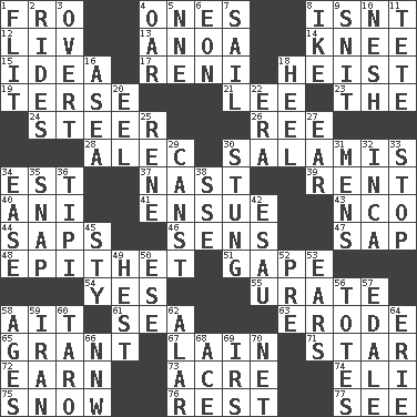 ACROSS 1. From 4. Singles 8. Is not 12. 54 in ancient Rome 13. Small Philippine buffalo 14. Leg joint 15. The main thing one is thinking about 17. Painter Guido (1575-1642) 18. Robbery 19. Laconic 21. Area sheltered from the wind 23. Definite Article 24. Bull 26. Portuguese money of account (variant) 28. Actor Baldwin 30. Deli grouping 34. Eastern Standard Time (abbr.) 37. Political cartoonist Thomas 39. Monthly bill 40. Cuckoo 41. Take place subsequently 43. Non-commissioned officer (abbr.) 44. Plant excrements 46. Elected reps. 47. Plant excrement 48. Curse 51. Yawn 54. Affirmative reply 55. A salt of uric acid 58. Small island 61. Ocean 63. Wear away 65. Let have 67. (Had) reclined 71. Play the lead 72. Merit 73. Land measure 74. Connecticut Ivy Leaguer 75. Frozen precipitation 76. Respite 77. Observe DOWN 1. Secret move to avoid paying debts 2. Amusement-park features 3. Unconcealed 4. Boat paddle 5. Compass dir. 6. Period of immesurable duration 7. Travel by water 8. Mamie's mate 9. In a ____ (agitated or irritated) 10. Tender 11. False hair 16. At sea 18. The bottom of a shoe or boot 20. Snakelike fish 22. Epoch 25. French philosopher Descartes 27. Ewer handle 29. 2nd pers. sing. pres. of can (arch.) 30. Feeling sharp psychological pain 31. Not women's 32. South American Indian 33. Constrict 34. Comfort 35. Fastener 36. Native american tent (variation) 38. Compass dir. 42. He sold his birthright 45. Filthy place 49. Command 50. Compass dir. 52. Before (prefix) 53. Hearing organs 56. Hauls 57. Peak District village in England 58. Eras 59. SW Asia republic 60. Pacific island yam 62. Having or resembling wings 64. 4th largest of the Great Lakes 66. Compass dir. 68. Adept person 69. Big collection agency 70. Remaining after all deductions