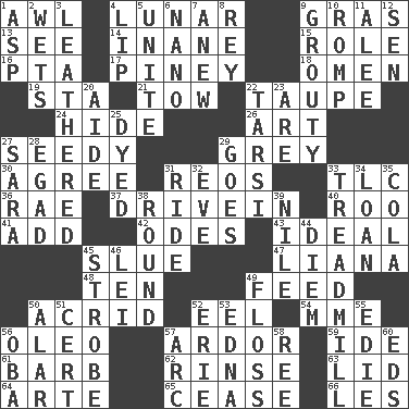 ACROSS 1. Leather borer 4. Type of eclipse 9. Pate de foie ____ 13. Observe 14. Silly 15. Hero or heavy, e.g. 16. Parent Teacher Assoc. 17. Abounding in pines 18. Sign of something about to happen 19. R.R. building 21. Pull behind 22. Grayish beige 24. Flintstone garb 26. Nonscientific branch of learning 27. Morally degraded 29. Jennifer or Joel 30. Match 31. Vintage cars 33. Affectionate concern, for short 36. Actress Charlotte 37. Popular '50s hangout 40. Friend of Pooh 41. Increase 42. Lyric poems 43. Perfect 45. Change direction abruptly 47. Climbing, woody, usually tropical vines 48. "___ Little Indians" 49. Nourish 50. Sour-tasting 52. Snakelike fish 54. Madame (abbr.) 56. Margarine 57. Zeal 59. Binary compound 61. Sharp remark 62. Wash lightly 63. Hat (slang) 64. Johnson of "Laugh-In" 65. Desist 66. French article DOWN 1. Viper 2. Moistens 3. Resembling or made to resemble leather 4. Mouth edge 5. Join together 6. Billionth: prefix 7. Afresh 8. Marina Del _, California 9. Sullen 10. Frolic 11. Toward shelter 12. Elected rep. 20. Assistant 22. Tarsus (plural) 23. "We ___ not amused" (Victoria) 25. Colored 27. "Two Mules for Sister ____" 28. Mild oath 29. Travels 31. Travel on an animal 32. First lady 33. Excercise machine 34. Grant temporary use of 35. Root beer relative 38. Unit of ammunition 39. Mediterranean tributary 44. South Vietnam president (1954) 45. Disco prop 46. Luau accessory 49. Soft thread for cleaning between teeth 50. Having or resembling wings 51. Sure thing 52. One of the Great Lakes 53. Pulitzer Prize-winning author Ferber 55. Singer Brickell 56. Chief or king in Benin or Nigeria 57. Curve 58. To sift 60. Begley and Asner