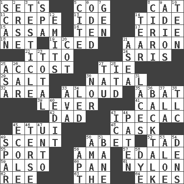 ACROSS 1. Puts into a specified state 5. Gear tooth 8. Feline 11. Streamer paper 13. Binary compound 14. Periodic rise and fall of the sea level 15. Indian state 16. "___ Little Indians" 17. 4th largest of the Great Lakes 18. Remaining after all deductions 19. On the rocks 21. Composer Copland 22. "Tell ____ the Marines!" 24. Indian titles of respect 25. Buttonhole 27. Neckwear 29. Table seasoning 30. Relating to or accompanying birth 32. Type of rug 33. Verbally 35. Blind as ____ 39. Crowbar 41. Give a ring to 42. June honoree 43. Medicinal drug used to evoke vomiting 45. Needle case 48. Keg 49. Aroma 50. Collude with 52. Small amount or degree 55. Left side of a ship or aircraft 56. Housemaid (var.) 57. Peak District village in England 59. In addition 60. Baking dish 61. High-strength synthetic material 62. Portuguese money of account (variant) 63. Definite Article 64. Makes supply last DOWN 1. Glance over 2. Celtic language 3. A testis 4. Health resort 5. Quote 6. Wrote a lyric poem 7. Commissioned mil. rank 8. High-altitude cloud 9. Goodbye (Sp.) 10. Adolescent 12. Gives off 14. Pull into pieces 20. Small bed 21. Toward the sea 23. "_____ Recall" 25. White ___ sheet 26. Auto 27. The 19th letter of the Greek alphabet 28. It would 30. And not 31. Shoestrings 33. Actress Gardner 34. Directed 36. Sass 37. Wing 38. Affectionate concern, for short 40. Prepare for publication 43. Frozen water 44. Eucharist need 45. Learning spot: Fr. 46. Laconic 47. To (old English) 49. Practice fight 50. Nanny 51. Object of repulsion 53. Medicinal plant 54. Lairs 56. Fitting 58. Color