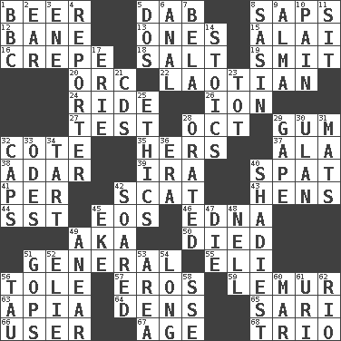 ACROSS 1. Fermented drink made from hops 5. Pat or tap gently 8. Plant excrements 12. Object of repulsion 13. Singles 15. Mountain range southwest of Kyrgyzstan 16. Streamer paper 18. Table seasoning 19. Stricken, poetically 20. The grampus (Milton) 22. Of or relating to Laos or its people 24. Travel on or in a vehicle 26. Electrically charged atom 27. Trial 28. Sep. follower 29. Chewing product 32. ____ d'Azur (French Riviera) 35. Possessive pronoun 37. According to 38. The sixth month of the Jewish calendar 39. Retirement account (abbr.) 40. Petty quarrel 41. For each 42. Leave at once 43. Coop moms 44. Fast jet (abbr.) 45. Greek goddess of the dawn 46. Pulitzer Prize-winning author Ferber 49. Alias (abbr.) 50. Passed on 51. Commissioned military rank 55. Biblical high priest 56. Lacquered or enameled metalware 57. Greek god of love 59. Arboreal primate 63. Capital of Western Samoa 64. Habitations of wild animals 65. Indian skirt 66. One who uses or employs something 67. Ripen 68. Musical group of three DOWN 1. English channel? 2. Hearing organ 3. Compass dir. 4. News announcer 5. Two (Sp.) 6. Of or related to the anus 7. Actor Lugosi 8. Indian antelope 9. _ mater 10. Ache 11. Be seated 14. Unemotional ones 17. 4th largest of the Great Lakes 21. Music discs 23. Small child 25. Moral principles 28. Spoke pompously 29. Yawn 30. ____ Bator 31. Floor coverings 32. Balmoral and tarboosh 33. Lyric poems 34. Small pie 36. Epoch 40. Most dubious of character or honesty 42. Flew 45. Supplement with great effort 47. Expire 48. 1994 drama film starring Jodie Foster 49. Approach 51. Republicans 52. Writer Wiesel 53. Type of rug 54. Protracted 56. The 19th letter of the Greek alphabet 58. Compass dir. 60. Make imperfect 61. RI univ. 62. _ de Janeiro