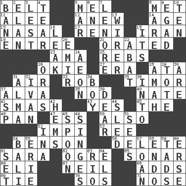 ACROSS 1. Waist strap 5. Cartoonist voice _ Blanc 8. Was introduced to 11. Toward shelter 12. Afresh 14. Mature 15. Relating to the nose 17. Painter Guido (1575-1642) 18. SW Asia republic 19. Main course 21. Spoke pompously 23. Nanny (var.) 25. Confederate soldiers (slang) 26. Migrant worker of the '30s 27. Period 28. "One Day ___ Time" 31. Atmosphere 33. Director Reiner 35. Southeast Indonesia island 37. Inventor's middle name 38. Lower and raise head in agreement 40. Nathan's nickname 41. Box-office sellout 43. It is so 45. Definite Article 46. Baking dish 47. Double-curved letter 50. In addition 52. Body of Kaffir warriors 53. To separate or throw off 54. Gillaume's butler role 56. Keyboard key 61. "Two Mules for Sister ____" 62. Legendary monster 65. Underwater navigation system 66. Biblical high priest 67. Famous astronaut Armstrong 68. Does sums 69. Neckwear 70. Distress signal 71. Characteristic smell of wine DOWN 1. Object of repulsion 2. Enthusiasm 3. For fear that 4. Rend 5. Spoil 6. Compass dir. 7. Poe poem 8. Female horse 9. Mild oath 10. "___ Little Indians" 13. One who wires 16. Path through which fluid escapes 18. ___ a Wonderful Life 20. Independent ruler or chieftain 22. Blind as ____ 24. Period of immesurable duration 26. Mouths or openings 28. Wet nurse 29. Carry 30. "We ___ not amused" (Victoria) 31. _ mater 32. "Terrible" tsar 34. Male child 36. To the inside or interior of 37. Cleo's killer 39. Letter starter 42. Is hesitant and indecisive 44. Downhill vehicle 48. Soup utensil 49. Scorches 51. Observes 52. _ tizzy (2 wds.) 54. Indonesian resort city 55. One of the Great Lakes 57. Grant temporary use of 58. Inside; within (prefix) 59. Bits 60. Celtic language 61. Put into a specified state 63. _ de Janeiro 64. Raised railways
