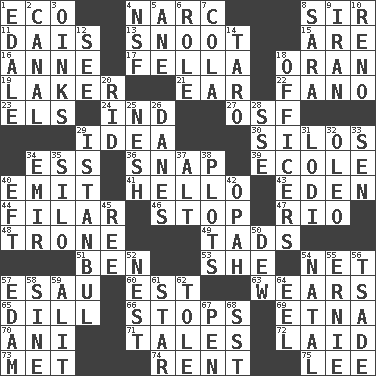 ACROSS 1. Environmental prefix 4. Drug cop 8. Title for a knight 11. Raised platform 13. Snout, nose 15. "We ___ not amused" (Victoria) 16. Singer Murray 17. Chap (slang) 18. Northwest Algerian city 19. Member of a famous L.A. basketball team 21. Ewer handle 22. Papal veil 23. Raised railways 24. Working for oneself (abbr.) 27. Order of Saint Francis (abbr.) 29. The content of cognition 30. Grain storage towers 34. Double-curved letter 36. Fastener 39. Learning spot: Fr. 40. Give off 41. Phone greeting 43. Locale of original sin 44. Having threads 46. Constrict 47. River (Sp.) 48. Marketplace scale 49. Small boys 51. Benjamin's nick name 53. A female animal or person 54. Remaining after all deductions 57. Son of Isaac 60. Eastern Standard Time (abbr.) 63. Puts on (as clothing) 65. Deli pickle 66. Obstructs or blocks passage 69. Inactive volcano in Sicily 70. Cuckoo 71. Falsehoods 72. Put down 73. Was introduced to 74. Monthly bill 75. Area sheltered from the wind DOWN 1. Peak District village in England 2. Lessep's creation 3. Pig sounds 4. Overdraft (abbr.) 5. A saturated hydrocarbon 6. Hero or heavy, e.g. 7. Root beer relative 8. "Two Mules for Sister ____" 9. SW Asia republic 10. Former U.S. Attorney General Janet 12. Observe 14. Edible starchy tuberous root 18. Persons of authority 20. To free from 25. Tender 26. Natives or inhabitants of Denmark 28. Compass dir. 29. Byzantium, centuries later 31. Farming town in central California 32. Margarine 33. Elected rep. 34. Independent ruler or chieftain 35. Grain storage tower 37. Keyboard modifier key 38. Schemes 40. Lizard (obsolete) 42. Brightly colored fish 45. Portuguese money of account (variant) 50. Morning condensation 52. A home for chicks 54. Relating to or accompanying birth 55. Bert's buddy 56. Sadhe (variant) 57. Dutch treat 58. Trig term 59. Set down 61. Play the lead 62. Lacquered or enameled metalware 64. Snakelike fish 67. Writing instrument 68. Fast jet (abbr.)