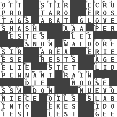 ACROSS 1. Often (poetically) 4. Use a spoon 8. Shade of tan 12. Adept person 13. Pacific island yam 14. Greek god of love 15. Labels 17. Blind as ____ 18. Michael Jackson trademark 19. Box-office sellout 21. American Automobile Association (abbr.) 23. For each 24. _____ Park, CO 26. Flowery wreath 28. Frozen precipitation 30. Apple salad 34. Title for a knight 37. Length times width 39. One of the Great Lakes 40. Compass dir. 41. Musical pauses 43. Ripen 44. Writer Wiesel 46. Proofreading order 47. Hat (slang) 48. Pre-World Series prize 51. Precipitation 54. Pass on 55. Trap for birds or small mammals 58. Compass dir. 61. Spanish title 63. New (sp.) 65. Sibling's daughter 67. Petroleums 71. Broad, flat, thick piece 72. To the inside or interior of 73. Makes supply last 74. Wedding promise 75. Trial 76. For fear that 77. Unit of force equal to gravity DOWN 1. Elects 2. Movie unit 3. Ancient Roman robes 4. R.R. building 5. Bar bill 6. Lyricist Gershwin 7. Round or rotation of duties 8. Snakelike fish 9. Riding implement 10. Be footloose 11. One who uses or employs something 16. Fast planes 18. Highlander 20. Layer 22. According to 25. Fly high 27. Binary compound 29. Take or capture by force 30. Wetness 31. Relating to the mouth 32. Swiss mountan, "Queen of the Mountains" 33. Nourish 34. Ooze 35. Small island 36. It's straight from the horse's mouth 38. Eastern Standard Time (abbr.) 42. Comedian Laurel of Laurel & Hardy 45. Conclude 49. Helper 50. Modern: prefix 52. Electrically charged atom 53. Horse sense 56. Major League Baseball Commissioner Bud 57. Elude 58. In a ____ (agitated or irritated) 59. Trig term 60. Moistens 62. Christmas carol 64. Mitch Miller's instrument 66. Small bed 68. Eisenhower's nickname 69. French article 70. Fast jet (abbr.)
