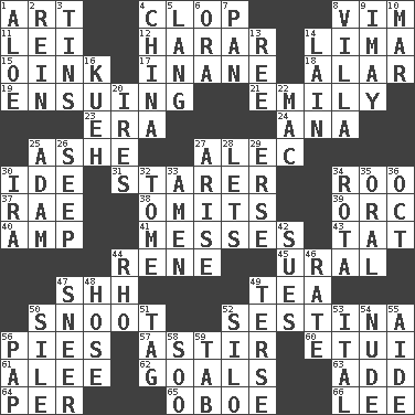 ACROSS 1. Tate display 4. Hoof sound 8. Zeal 11. Luau accessory 12. Ethiopian city, capital of Harari 14. Pale green bean 15. Pig sound 17. Lacking in sense or substance 18. Having or resembling wings 19. Following as a consequence or result 21. Poet Dickinson 23. Period 24. Santa ___, CA 25. American tennis player Robert 27. Actor Baldwin 30. Binary compound 31. A viewer who gazes fixedly 34. Friend of Pooh 37. Actress Charlotte 38. Leaves out 39. The grampus (Milton) 40. Electrical Unit 41. Makes clutter 43. Make lace 44. French philosopher Descartes 45. Mountain range 47. Quiet! 49. Afternoon social gathering 50. Snob 52. French poetic form 56. Sliced desserts 57. Moving about 60. Needle case 61. Toward shelter 62. Purposes of endeavors 63. Say or write further 64. For each 65. Mitch Miller's instrument 66. Area sheltered from the wind DOWN 1. _ vera 2. It's straight from the horse's mouth 3. Metal containers 4. Large country 5. Austrian-born American filmmaker Fritz 6. Mouth or opening 7. Baking dish 8. Country residence 9. "If ____ say so..." 10. Third mo. 13. To separate or throw off 14. (Had) reclined 16. Malaysian steamed pastry 20. Angers 22. Big _ 25. First of billions? 26. Ooze 27. Get up 28. Allows 29. Celtic language 30. Retirement account (abbr.) 32. Heavy book 33. So be it 34. Round or rotation of duties 35. Of the mouth 36. Sep. follower 42. Takes to court 44. 17th letter of the Greek alphabet 46. Pace 47. Contemptuous expression 48. Stockings 49. Laconic 50. Filth; sediment 51. Label 52. Grain storage tower 53. Slanted text style (abbr.) 54. Unadorned 55. Assistant 56. Infant food 58. "Barney Miller" actor Jack 59. Keyboard key