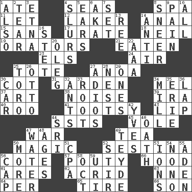 ACROSS 1. Had dinner 4. Oceans 8. Health resort 11. Allow 12. Member of a famous L.A. basketball team 14. Of or related to the anus 15. Without 17. A salt of uric acid 18. Famous astronaut Armstrong 19. Speakers 21. Consumed 23. Raised railways 24. Atmosphere 25. Haul 27. Small Philippine buffalo 30. Small bed 31. Place where plants grow 34. Cartoonist voice _ Blanc 37. Nonscientific branch of learning 38. Annoying sound 39. Retirement account (abbr.) 40. Friend of Pooh 41. Tootsie (variant) 43. Mouth edge 44. Fast planes 45. Short-tailed, large-bodied rat 47. Armed conflict 49. Afternoon social gathering 50. Mysterious quality of enchantment 52. French poetic form 56. ____ d'Azur (French Riviera) 57. Inclined to pout 60. Parka part 61. Ancient Greek god of war 62. Bitter 63. Compass dir. 64. For each 65. Hoop that covers a wheel 66. Male offspring DOWN 1. In addition 2. Separate forcefully 3. Inactive volcano in Sicily 4. Plays smoothly or legato 5. Hearing organs 6. Alias (abbr.) 7. Put into a specified state 8. Contemptuous expression 9. Ache 10. 100% 13. To separate or throw off 14. Opposed to 16. Proofreading order 20. Cassini of fashion 22. Auto club (abbr.) 25. "Corrida" creature 26. "Beetle Bailey" pooch 27. Goodbye (Sp.) 28. Egg locale 29. Washington bills 30. Automobile 32. Pismires 33. Carrot, for example 34. Place where flour is made 35. One of the Great Lakes 36. Infant locale 42. Jacques Cousteau's middle name 44. _ Lanka 46. Pledge 47. Wetness 48. Eons 49. Miss Universe 1986, Barbara Palacios _ 50. Greater amount 51. Accounting whiz (abbr.) 52. Use a swizzle stick 53. Charged particles 54. Words to Nanette 55. Arabian gulf 56. Head covering 58. Sep. follower 59. RI univ.