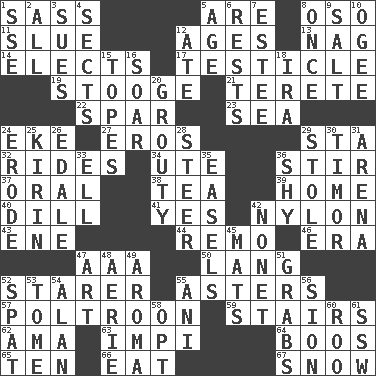 ACROSS 1. Backtalk 5. "We ___ not amused" (Victoria) 8. Bear (Spanish) 11. Turn sharply 12. Eons 13. Tired old horse 14. Chooses 17. A testis 19. Moe Howard, for one 21. Cylindrical with tapered ends 22. Practice fight 23. Ocean 24. Supplement with great effort 27. Greek god of love 29. R.R. building 32. Amusement-park features 34. Shoshoni 36. Agitate 37. Taken by mouth 38. Afternoon social gathering 39. Dwelling 40. Deli pickle 41. Consenting reply 42. High-strength synthetic material 43. Compass dir. 44. San ____ (Riviera town) 46. Period 47. American Automobile Association (abbr.) 50. Austrian-born American filmmaker Fritz 52. A viewer who gazes fixedly 55. Michaelmas daisies 57. Coward 59. Flight of steps 62. Housemaid (var.) 63. Body of Kaffir warriors 64. Scornful sounds 65. "___ Little Indians" 66. Erode 67. Overwhelm DOWN 1. Compass dir. 2. 100% 3. Takes to court 4. Religious groups 5. Mature 6. Musical pauses 7. First name in cosmetics 8. Single time 9. Table seasoning 10. Double curve, resembling the letter S 12. Had dinner 15. Drinks excessively 16. Fly high 18. Retirement account (abbr.) 20. Cross 24. Wear away 25. Japanese brewing company 26. Peak District village in England 28. Bull 29. Fur scarf 30. The easternmost of the Lesser Sundas 31. Sports stadium 33. Pipe bend 35. Artist's stands 36. Like a shrinking violet 42. Music written for nine 45. Floor protectors 47. Nonscientific branch of learning 48. Nest on high 49. Odor 51. Seizes 52. Petty quarrel 53. Heavy book 54. Actor Alda or Thicke 55. Cuckoo 56. The Jewish people; Israel 58. Elect 60. Friend of Pooh 61. Compass dir.