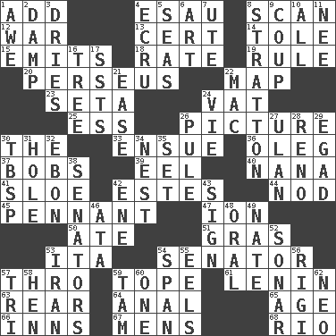 ACROSS 1. Find the sum of 4. Son of Isaac 8. Glance over 12. Armed conflict 13. Sure thing 14. Lacquered or enameled metalware 15. Gives off 18. Pace 19. Governing power 20. Son of Zeus who helped slay Medusa 22. Atlas unit 23. Bristle 24. Large container 25. Curvy letter 26. Photo 30. Definite Article 33. Take place subsequently 36. Cassini of fashion 37. Moves up and down 39. Snakelike fish 40. Nanny 41. A type of plum 42. _____ Park, CO 44. Allow head to fall sleepily 45. Pre-World Series prize 47. Electrically charged atom 50. Had dinner 51. Pate de foie ____ 53. Call ___ day 54. Legislator 57. Through, poetically 59. Drink excessively 61. Soviet premier 1918-24 63. Bring up, as a child 64. Of or related to the anus 65. Personal question 66. Restaurants 67. Not women's 68. _ de Janeiro DOWN 1. Deep reverence 2. Moist 3. Frees from moisture 4. Shade of tan 5. Oceans 6. Nonscientific branch of learning 7. Shoshoni 8. Ski resort town in Vermont 9. Overturn; upset 10. Everything 11. Born 16. Woody plant 17. Fast planes 21. Relaxation 22. Apple computer (short form) 24. Compete 26. Whimper 27. ____ Bator 28. Western Nevada city 29. Mild oath 30. Cook's measure (abbr.) 31. Hollow 32. Inky black, to poets 34. Egg locale 35. Put into a specified state 38. Elected representatives 42. Compass dir. 43. Omen 46. _ moment's notice (2 wds.) 48. Of the mouth 49. Nathan's nickname 52. Underwater navigation system 53. SW Asia republic 54. Connect, as a bridge 55. Snakelike fish 56. Swiss mountan, "Queen of the Mountains" 57. Three (prefix) 58. Layer 59. Scottish cap 60. Single 62. Modern: prefix