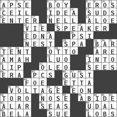 ACROSS 1. Domed church section 5. Male child 8. Greek god of love 12. To provide with a ceiling 13. It may be bright or harebrained 15. Soap bubbles 16. Keyboard key 18. 1994 drama film starring Jodie Foster 19. _ vera 20. Compete 22. Orator 24. Pulitzer Prize-winning author Ferber 26. Air pressure measure (abbr.) 27. Egg locale 28. Health resort 29. Drinking establishment 32. Portable shelter 35. "Beetle Bailey" pooch 37. "We ___ not amused" (Victoria) 38. Housemaid 39. Nilotic language 40. To the inside or interior of 41. Mouth edge 42. Margarine 43. Observes 44. Epoch 45. Personal Computers (abbr.) 46. Abrupt rush of wind 49. Enemy 50. Singer James 51. Electrical Measurement 55. A really long time 56. "Corrida" creature 57. Olfactory organ 59. Tolerate 63. Having or resembling wings 64. Oceans 65. Freehold land 66. Actor Lugosi 67. Institute legal proceedings 68. Tennis shots DOWN 1. Adept person 2. Fenced enclosure 3. Be seated 4. Veterans Day date 5. Storage container 6. Lyric poems 7. Sharp bark 8. 1973 Nobel Price Winner (Physics) Leo 9. General guideline 10. Scent 11. Compass dir. 14. City in Syria 17. Travel on or in a vehicle 21. Followers of ems 23. White ___ sheet 25. Ringlike coral islands and reefs 28. Moe Howard, for one 29. Object of repulsion 30. Johnson of "Laugh-In" 31. Vintage cars 32. Story 33. Independent ruler or chieftain 34. California wine valley 36. Third day of the wk. 40. Byzantium, centuries later 42. Seas 45. Cooking vessel 47. Shoshoni 48. Portico 49. Plants 51. Grand slam 52. Relating to the mouth 53. Moves 54. Son of Isaac 56. Bar bill 58. Compass dir. 60. Wedding promise 61. Small moist lump or mass 62. Raised railways