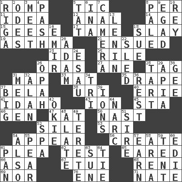 ACROSS 1. Play 5. Nervous spasm 8. For each 11. The content of cognition 12. Of or related to the anus 14. Personal question 15. Honkers 17. Docile 18. Kill 19. Respiratory problem 21. Took place subsequently 23. Binary compound 25. Cause heat under the collar 26. Mouths or openings 27. One (Scot) 28. Label 31. Atlas unit 33. Floor protector 35. Window treatment 37. Actor Lugosi 38. RI univ. 40. One of the Great Lakes 41. Potato state 43. Electrically charged atom 45. R.R. building 46. Commissioned military rank (abbr.) 47. Krazy ___ of comics 50. Political cartoonist Thomas 52. Filth; sediment 53. _ Lanka 54. Seem 56. Make 61. Entreaty 62. Trial 65. Having ears or earlike features 66. White ___ sheet 67. Needle holder 68. Painter Guido (1575-1642) 69. And not 70. Compass dir. 71. Nathan's nickname DOWN 1. Capital of Latvia 2. Lyric poems 3. Confront 4. Romantic infatuation 5. Make lace 6. _ tizzy (2 wds.) 7. Device for capturing images 8. Diluted with white 9. Mild oath 10. Marina Del _, California 13. Soviet premier 1918-24 16. Independent ruler or chieftain 18. Institute legal proceedings 20. First man 22. Downhill vehicle 24. Son of Isaac 26. Brightly colored fish 28. Small pie 29. Capital of Western Samoa 30. Turn to the right 31. Ancient Persian 32. Actor Alda or Thicke 34. Three (prefix) 36. State of inaction 37. Massive 39. Charged particles 42. Migrant worker of the '30s 44. Drug cop 48. Having winglike extensions 49. Cylindrical with tapered ends 51. Beget 52. Health resort 54. In addition 55. Lightbulb-shaped fruit 57. Merit 58. Type of rug 59. Portable shelter 60. Singer Brickell 61. Baking dish 63. Player for Phoenix 64. Neckwear