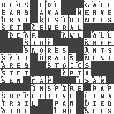 ACROSS 1. Vintage cars 5. Enemy 8. Highlander 12. Hearing organs 13. Actress Gardner 14. Effrontery 15. Naughty child 16. Dwellings 19. Arrange properly for use 20. Commissioned military rank 21. Letter starter 23. Leather borer 24. 100% 27. Male parent of an animal 30. Leg joint 31. Sounds asleep 34. Pismires 35. Suttee (variant) 38. Naughty children 40. Egg locale 41. Ancient Greek god of war 42. Unemotional ones 44. Proofreading order 45. Capital of Western Samoa 46. Elected rep. 47. Atlas unit 50. Russian ruler of old 53. Motivate 57. Hit sharply and swiftly 59. Supplementary 63. Inactive volcano in Sicily 64. Lag or linger behind 65. Baking dish 66. Passed on 67. Assistant 68. Compass dir. 69. Observes DOWN 1. Confederate soldiers (slang) 2. Having ears or earlike features 3. Declaim 4. Fast jet (abbr.) 5. Conductor's collection 6. Baking chamber 7. Relaxation 8. Commissioned military rank (abbr.) 9. Curve 10. Night before a holiday 11. French article 14. 1994 drama film starring Jodie Foster 17. Lyricist Gershwin 18. Obsolete 20. Amused look 22. Help 24. Queen of England 1702-14 25. Allows 26. For fear that 28. Director Reiner 29. Blunders 30. Sunflower state 32. Ingest 33. Portico 35. Backtalk 36. Johnson of "Laugh-In" 37. Adolescent 39. Small drink 43. Quote 47. Place where flour is made 48. A saturated hydrocarbon 49. Pacific Standard Time (abbr.) 51. Nick name for Arthur 52. Indian princess (variant) 54. Corncob 55. _ the terrible 56. French philosopher Descartes 58. Writing tablets 59. R.R. building 60. RI univ. 61. Writing tablet 62. Sliced dessert 63. Begley and Asner