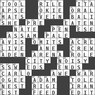 ACROSS 1. Utensil 5. Cause heat under the collar 9. Call ___ day 12. Domed church section 13. Migrant worker of the '30s 14. Spoken 15. Floor coverings 16. Distinctive style or manner 17. Indonesian resort city 18. A female animal or person 19. Before (prefix) 21. Ingested 22. Nathan's nickname 24. Animal enclosure 26. Compass dir. 27. Indian state 28. Diluted with white 29. Advice 30. Leaves out 32. Measure of real estate 36. Not recorded 37. A saturated hydrocarbon 38. Group working together 39. An important port of Yemen 40. Sports stadium 42. Hero or heavy, e.g. 43. Municipality 44. Annoyingly loud 46. Compass dir. 49. Begley and Asner 50. Extremities 51. Monte _, Las Vegas Hotel/Casino 53. Deep reverence 54. Armed conflict 57. Double curve, resembling the letter S 58. First of billions? 61. Lacquered or enameled metalware 62. Egg locale 63. Swiss mountan, "Queen of the Mountains" 64. SW Asia republic 65. Eastern Standard Time (abbr.) 66. Nourish 67. Prepare for publication DOWN 1. Scottish caps 2. Brightly colored fish 3. Clearly or manifestly demonstrative 4. French article 5. Be footloose 6. Mamie's mate 7. Cards in a Roman deck? 8. Car or cant ending 9. Feeling or showing extreme anger 10. Stories 11. Place in a line 14. Chief or king in Benin or Nigeria 19. Parent Teacher Assoc. 20. San ____ (Riviera town) 21. Compass dir. 23. NE Netherlands city 24. Eucharist need 25. Raised railways 27. Enthusiastic 28. Abounding in pines 29. Wing 31. Shops 32. Sour-tasting 33. What you're doing now 34. Trust 35. She-sheep 40. Help 41. Afresh 43. Corporate head (abbr.) 45. Single 46. Biscuitlike quick bread 47. Gurus 48. Obtain by seizing forcibly or violently 52. Allow 53. Among 55. Jai _ 56. Monthly bill 58. Sandy's bark 59. Expire 60. Personal question 61. Make a knot