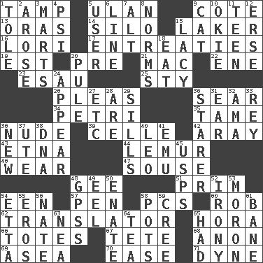 ACROSS 1. Pack (down) 5. ____ Bator, Mongolia 9. ____ d'Azur (French Riviera) 13. Mouths or openings 14. Grain storage tower 15. Member of a famous L.A. basketball team 16. Australian parrot (variant) 17. Pleas 19. Eastern Standard Time (abbr.) 20. Before (prefix) 21. Big _ 22. Compass dir. 23. Son of Isaac 25. Filthy place 26. Entreaties 30. Scorch 34. _ dish (used to culture cells) 35. Docile 36. Unadorned 39. Cell (Danish) 42. Like ___ of sunshine 43. Inactive volcano in Sicily 44. Arboreal primate 46. Put on (as clothing) 47. Lush 48. Unit of force equal to gravity 51. Demure 54. Car or cant ending 57. Writing instrument 58. Personal Computers (abbr.) 60. Director Reiner 62. Interpreter 65. Israeli folk dance 66. Hauls 67. Wig 68. At once, immediately (arch.) 69. At sea 70. Relaxation 71. Centimeter-gram-second unit of force DOWN 1. Lacquered or enameled metalware 2. Came up 3. Shops 4. 23rd letter of the Greek alphabet 5. One who uses or employs something 6. Actor's bit 7. The first octave above the treble staff 8. Typical standards 9. Domesticated feline 10. Migrant worker of the '30s 11. Adolescent 12. Celtic language 15. Made of lace 18. Ingest 20. Whimper 24. Become visible 27. And so on (abbr.) 28. "We ___ not amused" (Victoria) 29. Beverly of Met fame 30. A viewer who gazes fixedly 31. Ewer handle 32. Housemaid (var.) 33. Marina Del _, California 36. ___ Haven, CT 37. Shoshoni 38. Heredity factor (abbr.) 40. Lion 41. Australian flightless bird 45. United States Postal Service (abbr.) 48. Global Positioning Systems (abbr.) 49. Snakelike fish 50. Related on the mother's side 52. Literary sarcasm 53. Person of subnormal intelligence 54. Singer James 55. Greek god of love 56. Nathan's nickname 58. Cooking vessels 59. Algonquian 61. Object of repulsion 63. Teachers' org. 64. Afternoon social gathering 65. Possessed