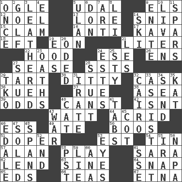 ACROSS 1. Stare at amorously 5. Freehold land 9. Raised railways 12. Christmas carol 13. Old wives' tales, e.g. 14. Clip 15. Burrowing marine mollusk 16. Opposed to 17. Polynesian shrub of the pepper family 18. Lizard (obsolete) 19. A really long time 21. 61 cubic inches 22. Parka part 24. Compass dir. 26. Followers of ems 27. Gospel singer Marvin 28. Fast planes 29. Small pie 30. Simple song 32. Keg 36. Malaysian steamed pastry 37. Regret 38. Toward the sea 39. Likelihood 40. 2nd pers. sing. pres. of can (arch.) 42. Is not 43. Electrical Unit 44. Sour-tasting 46. Double-curved letter 49. Had dinner 50. Scornful sounds 51. Drug addict 53. Eastern Standard Time (abbr.) 54. Metal container 57. Actor Alda or Thicke 58. Romp 61. "Two Mules for Sister ____" 62. Grant temporary use of 63. Trig term 64. Fastener 65. Begley and Asner 66. Beverages made from leaves 67. Inactive volcano in Sicily DOWN 1. At one time in the past 2. _ course 3. Resembling or made to resemble leather 4. Shade tree 5. ____ Bator, Mongolia 6. Spanish title 7. Tate display 8. Flowery wreath 9. Maternal 10. Make or become more lively 11. Practice fights 14. What Jean-Claude Killy likes to do 19. Greek goddess of the dawn 20. Wrote a lyric poem 21. French article 23. Curses 24. _____ Park, CO 25. Filthy place 27. Saudi Arabian king (1953-1964) 28. Difficult or unusual or dangerous feat 29. Ring climax 31. Feeling or showing extreme anger 32. Capital of Egypt 33. Aide 34. Transmit 35. Krazy ___ of comics 40. Feline 41. Bar bills 43. Armed conflict 45. Small bed 46. Peak District village in England 47. Having a sole or soles 48. Connects, as a bridge 52. Conclude 53. Sight organs 55. SW Asia republic 56. California wine valley 58. Pacific Standard Time (abbr.) 59. Whopper 60. Santa ___, CA 61. Compass dir.