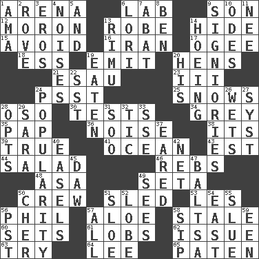 ACROSS 1. Sports stadium 6. Experiment locale 9. Boy, to dad 12. Person of subnormal intelligence 13. Loose flowing garment 14. Flintstone garb 15. Shun 16. SW Asia republic 17. Double curve, resembling the letter S 18. Double-curved letter 19. Send forth 20. Coop moms 21. Son of Isaac 23. One more than two 24. Inconspicuous attention getter 25. Overwhelms 28. Bear (Spanish) 30. Trials 34. Jennifer or Joel 35. Infant food 36. Annoying sound 38. It is 39. Loyal 41. Sea 43. Eastern Standard Time (abbr.) 44. Vegetable dish 46. Confederate soldiers (slang) 48. White ___ sheet 49. Stalk of a moss capsule 50. Ship's personnel 51. Downhill vehicle 53. French article 56. Silvers or Donahue 57. _ vera 58. Lacking originality or spontaneity 60. Puts into a specified state 61. Tennis shots 62. Come out of 63. Attempt 64. Area sheltered from the wind 65. Eucharist need DOWN 1. Nursemaid (var.) 2. Be footloose 3. Greek god of love 4. Annoying sounds 5. Added to 6. Australian parrot (variant) 7. Blind as ____ 8. Benjamin's nick name 9. Seigniories (variant) 10. Lyric poems 11. Born 13. Tall New Zealand timber tree 14. Weeding 19. Eroded 20. Part of HMS, perhaps 22. Fast jet (abbr.) 24. Teen's desire 26. Soaks 27. System (abbr.) 28. Elects 29. "Two Mules for Sister ____" 31. "Barney Miller" actor Jack 32. Nervous spasm 33. Compass dir. 37. Having ears or earlike features 40. Artist's stands 42. Fish or hair follower 45. Simpleton 47. Greek mezzo-soprano Agnes 49. Observes 50. "Mermaids" star 51. _ gin 52. Ear part 54. Compass direction 55. Turn sharply 56. Pacific Standard Time (abbr.) 57. 100% 58. Small drink 59. Car or cant ending