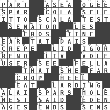 ACROSS 1. Piece 5. Toward the sea 9. Double curve, resembling the letter S 13. Practice fight 14. Root beer relative 15. Automatically 16. "Tell ____ the Marines!" 17. Any of the three canals of the cochlea 18. Trial 19. Legislator 21. French article 22. Greek god of love 23. Prong on a fork 24. Ewer handle 27. Make lace 28. Raised platform 29. Streamer paper 31. Hat (slang) 32. Composer Stravinsky 36. Western Nevada city 37. 54 in ancient Rome 38. Grand slam 39. One who uses or employs something 40. Observe 41. Man or boy (slang) 42. Not this but _ 44. A female animal or person 46. Distant 47. Riding implement 48. The bottom of a shoe or boot 50. Ingest 51. Preparing or cooking with lard 54. Jai ____ 56. Practice fights 58. Undercover agent 60. A home for chicks 61. Alleged 62. Genesis locale 63. Eras 64. Extremities 65. Elected reps. DOWN 1. Air pressure measure (abbr.) 2. Flats, for short 3. Assign a rank or rating to 4. Marketplace scale 5. Buttonhole 6. Fly high 7. Pipe bend 8. Auto club (abbr.) 9. Clearly or manifestly demonstrative 10. Honkers 11. Raised railways 12. Lizard (obsolete) 17. Portico 20. Johnson of "Laugh-In" 21. Cards in a Roman deck? 23. Small amount or degree 24. Shade of tan 25. Ancient Greek god of war 26. French philosopher Descartes 28. HTML Container Element 30. Likenesses of persons 31. Falsehood 33. _ course 34. Spanish pot 35. Stern 37. Allow 40. Plant excrement 41. Nourish 43. Being at a high temperature 44. Pottery fragments 45. Possessive pronoun 47. Stop 49. Citrus fruits 51. Put down 52. Thickened enlargement 53. Small, secluded valley 54. Santa ___, CA 55. Part of a journey 56. Compass dir. 57. Baking dish 59. Followers of ems