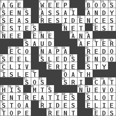 ACROSS 1. Personal question 4. Shed a tear 8. Scornful sounds 12. Elected reps. 14. Slender Brazilian palm 16. Actor Griffith 17. Oceans 18. Dwellings 20. _____ Park, CO 22. Remaining after all deductions 23. Eastern Standard Time (abbr.) 24. Born 25. Compass dir. 28. Santa ___, CA 30. Saudi Arabian king (1953-1964) 31. Following 35. Environmental prefix 37. California wine valley 40. Redecorate 41. Sew up the eyelids of hawks and falcons 42. Bobsleighs 44. Inside; within (prefix) 45. 154 in Roman numerals 46. 4th largest of the Great Lakes 47. Filthy place 48. Small island 50. Pledge 52. Mayday 54. _ Lanka 55. Feline 58. Part of HMS, perhaps 61. Mountains (abbr.) 63. New (sp.) 65. Pleas 70. Groove 71. Portico 72. Amusement-park features 73. Writer Wiesel 74. Drink excessively 75. Monthly bill 76. Begley and Asner DOWN 1. NE Netherlands city 2. Honkers 3. Related on the mother's side 4. Armed conflict 5. Compass dir. 6. Double-curved letter 7. Ache 8. Bar 9. At one time in the past 10. Lyric poems 11. System (abbr.) 13. Compass dir. 15. It may be bright or harebrained 19. Inactive volcano in Sicily 21. Ocean 26. Religious women 27. Peak District village in England 29. Anew 30. Finds the solution 32. Portable shelter 33. Whirlpool 34. Friend of Pooh 35. Snakelike fish 36. To provide with a ceiling 38. For each 39. Goodbye (Sp.) 41. _-fi 43. Burn superficially 49. Heavy book 51. Metal container 53. Play the lead 55. Cell (Danish) 56. Keep away from 57. Lugs 58. Behest 59. To the inside or interior of 60. Constrict 62. Commotion 64. Purpose 66. Actress Charlotte 67. Binary compound 68. Car or cant ending 69. Fast jet (abbr.)