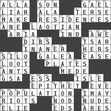 ACROSS 1. Silent film actress Nazimova 5. Boy, to dad 8. Highlander 12. One who doesn't tell the truth 13. Insect wing 14. Laconic 15. Cause to be 16. Homes 19. A saturated hydrocarbon 20. Of or relating to Laos or its people 21. Operatic vocal solo 23. Indiana (abbr.) 24. Deep reverence 27. Claim 30. Russian ruler of old 31. More empty; more void 34. Possessive pronoun 35. Grain storage tower 38. An organ shaped like a helmet 40. Relaxation 41. Spoils 42. Food holders 44. Pismires 45. Ancient Persian 46. Girls' org. (abbr.) 47. Double-curved letter 50. Capri or Wight 53. Curse 57. Night before a holiday 59. Census information 63. "If ____ say so..." 64. Debaucheries 65. Allow head to fall sleepily 66. Unadorned 67. Writer Wiesel 68. Begley and Asner 69. Ancient Greek god of war DOWN 1. _ mater 2. Woody, climbing, usually tropical plant 3. Member of a famous L.A. basketball team 4. "We ___ not amused" (Victoria) 5. "Two Mules for Sister ____" 6. Margarine 7. Political cartoonist Thomas 8. Commissioned mil. rank 9. Curve 10. Compass dir. 11. French article 14. Be inclined (to) 17. One more than two 18. Daniel's nick name 20. (Had) reclined 22. Foolish or stupid persons 24. At sea 25. Armed conflicts 26. Celtic language 28. Paper or plastic container 29. Fastener 30. College papers 32. Pipe bend 33. 480, 500 or 516 sheets of paper 35. Volcanic refuse 36. Charged atoms 37. Globular water bottle used in Asia 39. Had dinner 43. Prepare for publication 47. Snakelike fish 48. Health resort 49. Be seated 51. Arboreal primate 52. Elude 54. Prong on a fork 55. Parka part 56. Extremities 58. Sight organs 59. Before (prefix) 60. Petroleum 61. Luau course 62. Shoshoni 63. _ tizzy (2 wds.)