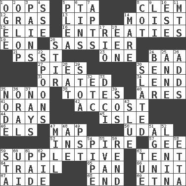 ACROSS 1. I made a mistake 5. Parent Teacher Association (abbr.) 8. Clement's nick name 12. Pate de foie ____ 13. Mouth edge 14. Wet 15. Writer Wiesel 16. Pleas 19. Period of immesurable duration 20. More disrespectful 21. Inconspicuous attention getter 23. Single 24. Sound made by sheep 27. Sliced desserts 30. Transmit 31. Spoke pompously 34. Grant temporary use of 35. Words to Nanette 38. Lugs 40. Ancient Greek god of war 41. NW Algerian seaport 42. Buttonhole 44. 24-hour periods 45. Small island 46. Raised railways 47. Atlas unit 50. Freehold land 53. Motivate 57. Turn to the right 59. Supplementary 63. Portable shelter 64. Lag or linger behind 65. Baking dish 66. A single undivided whole 67. Helper 68. Conclusion 69. Inactive volcano in Sicily DOWN 1. Double curve, resembling the letter S 2. Fourth or lowest deck 3. Aches 4. Compass dir. 5. Entreaty 6. Metal containers 7. Flats, for short 8. Small bed 9. Cards in a Roman deck? 10. Compass dir. 11. Mountains (abbr.) 14. Female horse 17. River (Sp.) 18. Car or cant ending 20. Commotion 22. Soup utensils 24. Fermented drink made from hops 25. Queen of England 1702-14 26. Sums up 28. Ingest 29. Portico 30. Scheduled 32. And so on (abbr.) 33. Tenth: prefix 35. Thickened enlargement 36. Spoken 37. Negative votes 39. Distress signal 43. Change direction abruptly 47. Place where flour is made 48. A saturated hydrocarbon 49. Pacific Standard Time (abbr.) 51. Representative 52. Soviet premier 1918-24 54. Corncob 55. "Terrible" tsar 56. Tear apart 58. Singer James 59. R.R. building 60. RI univ. 61. Writing tablet 62. Sliced dessert 63. Third day of the wk.