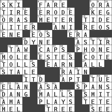 ACROSS 1. What Jean-Claude Killy likes to do 4. Conductor's collection 8. Mouth or opening 11. Become fatigued 13. Wear away 15. Barrel 16. Mouths or openings 17. Distance measurement 18. Periodic rise and fall of the sea level 19. 61 cubic inches 21. Cuckoo 22. Vintage cars 23. Compass dir. 24. Greek goddess of the dawn 27. Epoch 29. Unit of force 30. Moving about 34. The 23rd letter of the Hebrew alphabet 36. Balmoral and tarboosh 39. Give a jingle 40. Undercover agent 41. _____ Park, CO 43. ____ d'Azur (French Riviera) 44. For Whom the Bell _____ 46. Merit 47. 100% 48. Showing deterioration from age 49. Water falling in drops from the sky 51. It would 53. Fitting 54. Third day of the wk. 57. Style 60. White ___ sheet 63. Connects, as a bridge 65. Mild oath, euphamism for damn 66. Promenades 69. Stricken, poetically 70. Wet nurse (var.) 71. Live dramatic performances 72. Wig 73. Cartoonist voice _ Blanc 74. Relationship diagram 75. Observe DOWN 1. Fur scarf 2. Japanese brewing company 3. Feeling or showing extreme anger 4. Opposite of masc. 5. "We ___ not amused" (Victoria) 6. Round or rotation of duties 7. Paradise 8. Migrant worker of the '30s 9. Do over again 10. Eons 12. Compass dir. 14. 4th largest of the Great Lakes 18. File 13 20. Marina Del _, California 25. Single time 26. Gospel singer Marvin 28. Hit sharply and swiftly 29. Residence 31. Implement 32. International (abbr.) 33. Portuguese money of account (variant) 34. A blast of a horn 35. Silent film actress Nazimova 37. Parent Teacher Association (abbr.) 38. Spanish missionary in California 40. Mountains (abbr.) 42. Fastener 45. Arrange properly for use 50. ___ a Wonderful Life 52. Moist 54. Makes less strong or intense 55. Join together 56. First name in cosmetics 57. Dutch treat 58. Unable to walk 59. Of or related to the anus 61. Table seasoning 62. Having or resembling wings 64. Pacific Standard Time (abbr.) 67. Sodium hydroxide 68. Compass dir.