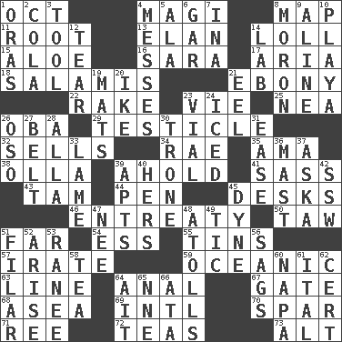 ACROSS 1. Sep. follower 4. Wise men 8. Atlas unit 11. Carrot, for example 13. Enthusiasm 14. Hang loosely or laxly 15. _ vera 16. "Two Mules for Sister ____" 17. Roberta Peters solo 18. Deli grouping 21. Dark wood 22. Immoral or dissolute person 23. Compete 25. Teachers' org. 26. Chief or king in Benin or Nigeria 29. A testis 32. Exchanges for money 34. Actress Charlotte 35. Nursemaid (var.) 38. Water jar 39. Hold, grip (Informal) 41. Backtalk 43. Scottish cap 44. Animal enclosure 45. Writing tables 46. Plea 50. The 23rd letter of the Hebrew alphabet 51. Distant 54. Curvy letter 55. Metal containers 57. Feeling or showing extreme anger 59. Pertaining to the sea 63. Actor's bit 64. Of or related to the anus 67. Yard entry 68. Toward the sea 69. International (abbr.) 70. Practice fight 71. Portuguese money of account (variant) 72. Afternoon social gatherings 73. The first octave above the treble staff DOWN 1. Mouths or openings 2. Root beer relative 3. Instrument 4. Makes clutter 5. Wing 6. Slender fish 7. _ tizzy (2 wds.) 8. Person of subnormal intelligence 9. Place in a line 10. Beach, in Buenos Aires 12. Rend 14. Experiment locale 19. Floor protectors 20. Mamie's husband 21. Snakelike fish 23. Small bottle 24. On the rocks 26. Bear (Spanish) 27. Waist strap 28. Silent film actress Nazimova 30. Heavy duty weighing machine 31. Comfort 33. Unable to walk 36. Vertical spar for supporting sails 37. "____ silly question..." 39. Flats, for short 40. Possessive pronoun 42. Compass dir. 45. Unit of force 47. Born 48. Ringlike coral islands and reefs 49. Nervous spasm 51. Of or pertaining to a thread or threads 52. Originate 53. Indian princess (variant) 56. Settles 58. Afternoon social gathering 60. California wine valley 61. Slanted text style (abbr.) 62. An absolute certainty 64. Small island 65. Compass dir. 66. "One Day ___ Time"