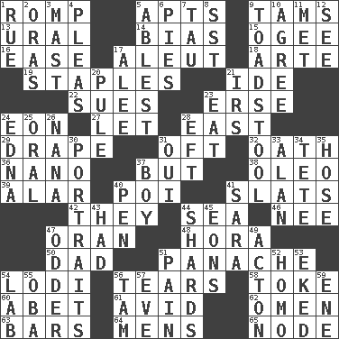 ACROSS 1. Play 5. Tenement units (abbr.) 9. Scottish caps 13. Mountain range 14. Prejudice 15. Double curve, resembling the letter S 16. Relaxation 17. Eskimo relative 18. Johnson of "Laugh-In" 19. Paper fasteners 21. Binary compound 22. Takes to court 23. Celtic language 24. Period of immesurable duration 27. Allow 28. 90 degrees 29. Window treatment 31. Often (poetically) 32. Pledge 36. Billionth: prefix 37. Yet 38. Margarine 39. Having or resembling wings 40. Luau course 41. Narrow boards 42. Those people 44. Ocean 46. Born 47. Northwest Algerian city 48. Israeli folk dance 50. June honoree 51. Flamboyance 54. Farming town in central California 56. Separates forcefully 58. Puff or smoke 60. Collude with 61. Enthusiastic 62. Sign of something about to happen 63. Long, evenly shaped pieces 64. Not women's 65. Thickened enlargement DOWN 1. Sorrow 2. Mouths or openings 3. Vertical spar for supporting sails 4. Entreaties 5. Most capable 6. Sliced desserts 7. The 19th letter of the Greek alphabet 8. Fast jet (abbr.) 9. Inedible or poisonous agaric 10. Match 11. Was introduced to 12. Observe 17. Toward shelter 20. Whine 21. Big collection agency 23. Erode 24. Pulitzer Prize-winning author Ferber 25. Spoken 26. Nanny 28. Lizard (obsolete) 30. Likenesses of persons 31. Fr. "Yes" 33. Actor Alda or Thicke 34. False hair 35. Flexible conduit 37. Male child 40. Writing instrument 41. "Two Mules for Sister ____" 43. Possessed 44. Pottery fragments 45. Immeasurably long periods of time 47. More peculiar 49. NE Massachussets city 51. Ache 52. Like (prefix) 53. Made supply last 54. Experiment locale 55. Chief or king in Benin or Nigeria 56. Scottish cap 57. First lady 59. Compass dir.
