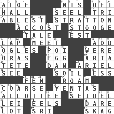ACROSS 1. Medicinal plant 5. Mountains (abbr.) 8. Often (poetically) 11. Promenade 12. Sew up the eyelids of hawks and falcons 13. Three (prefix) 14. Most capable 17. Ski resort town in Vermont 19. Buttonhole 21. Moe Howard, for one 22. Story 23. Eastern Standard Time (abbr.) 24. Infant locale 27. Rendezvous 29. Increase 32. Stares 34. Luau course 36. We are 37. Mouths or openings 38. Oval reproductive body of a fowl 39. Operatic vocal solo 40. False hair 41. Daniel's nick name 42. Satellite of Uranus 43. Perceive with the eye 44. The visible part of the earth's surface 46. Double-curved letter 47. Opposite of masc. 50. Wander aimlessly 52. Rough 55. Gossips 57. One to whom something is allotted 59. Beer mug 62. Luau accessory 63. Snakelike fish 64. Have the gumption 65. Car dealer's back yard 66. _ Lanka 67. Heroin DOWN 1. Housemaid (var.) 2. Experiment locale 3. Rounded earthenware pot or jar 4. Opt 5. Was introduced to 6. Laconic 7. Narrow boards 8. Von Bismarck 9. Toadlike animal 10. Prong on a fork 12. Fast jet (abbr.) 15. Fraudulent business schemes 16. Lacquered or enameled metalware 18. Small child 20. Oozed 24. Plunders 25. Match 26. Food holder 28. Ancient Roman robes 29. Nest on high 30. Frees from moisture 31. Allots cards 33. Compass dir. 35. Disregard 36. Armed conflict 42. Having winglike extensions 45. Charged atoms 47. Away 48. _____ Park, CO 49. Distance measurement 51. Women servants 52. Give a ring to 53. Margarine 54. Set down 55. Affirmative reply 56. Neighbor of Neb. 58. Biblical high priest 60. Epoch 61. Part of a journey