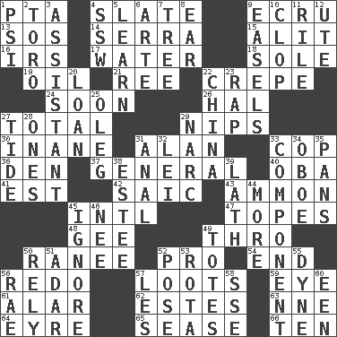 ACROSS 1. Parent Teacher Assoc. 4. Schedule 9. Shade of tan 13. Distress signal 14. Father Junipero _ 15. Set down 16. Big collection agency 17. Wetness 18. Flatfish 19. Petroleum 21. To separate or throw off 22. Streamer paper 24. Within a short period 26. Actor Linden 27. "_____ Recall" 29. Cuts off 30. Lacking in sense or substance 31. Actor Alda or Thicke 33. Police officer (slang) 36. Lair 37. Commissioned military rank 40. Chief or king in Benin or Nigeria 41. Eastern Standard Time (abbr.) 42. Ketch in the Levant 43. ID or VA city 45. International (abbr.) 47. Drinks excessively 48. Turn to the right 49. Through, poetically 50. Indian princess (variant) 52. Adept person 54. Conclude 56. Make new 57. Plunders 59. Sight organ 61. Having or resembling wings 62. _____ Park, CO 63. Compass dir. 64. Jane of fiction 65. Gospel singer Marvin 66. "___ Little Indians" DOWN 1. 23rd letter of the Greek alphabet 2. "Corrida" creature 3. Aide 4. Compass dir. 5. Acquire or gain knowledge or skills 6. Johnson of "Laugh-In" 7. Relationship diagram 8. Ewer handle 9. Artist's stands 10. Hoof sound 11. Cause heat under the collar 12. Shoshoni 20. Grant temporary use of 22. Large country 23. Strike 25. Cassini of fashion 27. Periodic rise and fall of the sea level 28. Singles 29. Drug cop 31. Of or related to the anus 32. Luau accessory 33. Part 34. Mitch Miller's instrument 35. Baking dishes 38. First name in cosmetics 39. Thin strip of wood or metal 44. Greater amount 45. Refuse to acknowledge 46. Born 49. Hauls 50. Trust 51. The sixth month of the Jewish calendar 52. Introduce or present, as a question 53. Roll call or roster of names 55. Centimeter-gram-second unit of force 56. Actress Charlotte 57. French article 58. Compass dir. 60. Car or cant ending