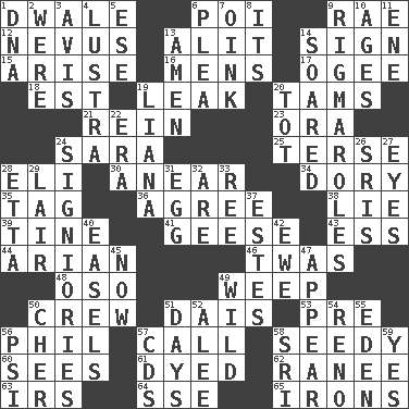 ACROSS 1. A sleeping potion; an opiate (poet.) 6. Luau course 9. Actress Charlotte 12. Congenital growth or mark on the skin 13. Set down 14. Public display of a written message 15. Ascend 16. Not women's 17. Double curve, resembling the letter S 18. Eastern Standard Time (abbr.) 19. Path through which fluid escapes 20. Scottish caps 21. It's straight from the horse's mouth 23. Mouth or opening 24. "Two Mules for Sister ____" 25. Laconic 28. Connecticut Ivy Leaguer 30. Approach 34. Rowboat 35. Label 36. Match 38. Untruth 39. Prong on a fork 41. Honkers 43. Double-curved letter 44. Believer in; advocate of (suffix) 46. It was, poetically 48. Bear (Spanish) 49. Shed a tear 50. Ship's personnel 51. Raised platform 53. Before (prefix) 56. Silvers or Donahue 57. Give a ring to 58. Sleazy 60. Observes 61. Colored 62. Indian princess (variant) 63. Big collection agency 64. Compass dir. 65. Removes the wrinkles DOWN 1. Heredity factor (abbr.) 2. Past tense of be (plural) 3. Opinion 4. A period of five years 5. Compass dir. 6. Entreaty 7. Pig sound 8. ___ a Wonderful Life 9. Complicated, petty procedures 10. Eras 11. Compass dir. 13. So be it 14. Flew 19. Climbing, woody, usually tropical vines 20. Small child 22. Epoch 24. Seigniories (variant) 26. Indian titles of respect 27. Snake ____ (dice throw) 28. Singer James 29. Den 31. Ovum 32. "We ___ not amused" (Victoria) 33. To riddle 37. _____ Park, CO 40. Artist's stands 42. She-sheep 45. Immediately 47. Become visible 49. Rampant 50. "Mermaids" star 51. 24-hour periods 52. Toward shelter 54. Former U.S. Attorney General Janet 55. Locale of original sin 56. Air pressure measure (abbr.) 57. Music discs 58. Indian title of respect (Mr.) 59. It is so