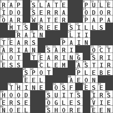 ACROSS 1. Hit sharply and swiftly 4. Schedule 9. Whimper 13. Wedding promise 14. Spanish missionary in California 15. Scent 16. Boat paddle 17. Wetness 18. Dad 19. Mountains (abbr.) 21. To sift 22. Beverly of Met fame 24. Precipitation 26. Cards in a Roman deck? 27. Separates forcefully 29. Ache 30. Believer in; advocate of (suffix) 31. Indian skirt 33. Sep. follower 36. Car dealer's back yard 37. Rending 40. Indian title of respect (Mr.) 41. Double-curved letter 42. Clement's nick name 43. Moving or stirring 45. Blemish 47. Military trainee 48. Snakelike fish 49. Period of immesurable duration 50. One or ones belonging to thee 52. Order of Saint Francis (abbr.) 54. Compass dir. 56. Parka part 57. Sets or collections 59. Big collection agency 61. Celtic language 62. Stares 63. Compete 64. Christmas carol 65. Dinah or Pauly 66. Car or cant ending DOWN 1. River (Sp.) 2. First of billions? 3. Likenesses of persons 4. Compass dir. 5. Acquire or gain knowledge or skills 6. Johnson of "Laugh-In" 7. Relationship diagram 8. Hearing organ 9. Cotton for raincoats, e.g. 10. Hereditary estate 11. Chops off 12. Epoch 20. "Two Mules for Sister ____" 22. Killed 23. One more than two 25. Is not 27. Story 28. Greek god of love 29. Demure 31. Table seasoning 32. "We ___ not amused" (Victoria) 33. Clearly or manifestly demonstrative 34. Baby bed with high sides 35. Hoop that covers a wheel 38. Learning spot: Fr. 39. Stare wonderingly 44. _ gin 45. A glass for beer 46. Fenced enclosure 49. Following 50. "Corrida" creature 51. Flexible conduit 52. Ending for "Through" and "Enough" 53. Grain storage tower 55. 4th largest of the Great Lakes 56. Layer 57. Distress signal 58. Compass dir. 60. Elected rep.
