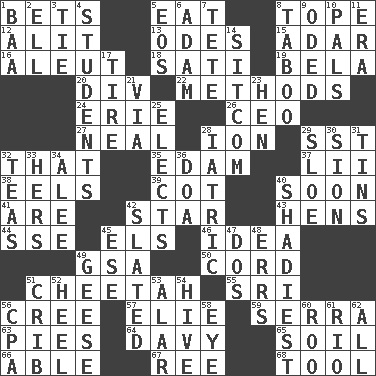 ACROSS 1. Antes 5. Erode 8. Drink excessively 12. Came down and settled, as after flight 13. Lyric poems 15. The sixth month of the Jewish calendar 16. Native American of Southwest Alaska 18. Suttee (variant) 19. Actor Lugosi 20. HTML Container Element 22. Modes 24. 4th largest of the Great Lakes 26. Corporate head (abbr.) 27. Actress Patricia 28. Electrically charged atom 29. Fast jet (abbr.) 32. Not this but _ 35. Dutch treat 37. Cards in a Roman deck? 38. Snakelike fish 39. Small bed 40. Within a short period 41. "We ___ not amused" (Victoria) 42. Play the lead 43. Coop moms 44. Compass dir. 45. Raised railways 46. The content of cognition 49. Girls' org. (abbr.) 50. Drawstring 51. Leopard's kin 55. Indian title of respect (Mr.) 56. Algonquian 57. Writer Wiesel 59. Spanish missionary in California 63. Sliced desserts 64. American folk hero Crockett 65. Earth 66. Competent 67. Portuguese money of account (variant) 68. Implement DOWN 1. Sound made by sheep 2. Pipe bend 3. Make a knot 4. SAT takers 5. Greek goddess of the dawn 6. First man 7. Wig 8. Off limits 9. Wrote a lyric poem 10. Friends 11. Epoch 14. "Cheers" or "Ellen" 17. Hoop that covers a wheel 21. By way of 23. Layer 25. Opts 28. Of or pertaining to medicine 29. A type of plum 30. The Jewish people; Israel 31. Canisters 32. Afternoon social gatherings 33. Possessive pronoun 34. Toward shelter 36. ___ good deed 40. Most dubious of character or honesty 42. Scheduled 45. Compass dir. 47. Two (Sp.) 48. Blunders 49. Honkers 51. Baby bed with high sides 52. The bottom of a shoe or boot 53. Having or resembling wings 54. Hub of activity 56. Tax preparer (abbr.) 58. Sight organ 60. Friend of Pooh 61. River (Sp.) 62. 100%