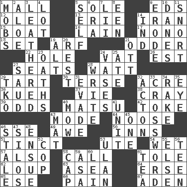 ACROSS 1. Shopping center 5. Not divided or shared with others 9. Begley and Asner 12. Margarine 13. One of the Great Lakes 14. SW Asia republic 15. Water vessel 16. (Had) reclined 17. Words to Nanette 18. Arrange properly for use 19. Sandy's bark 21. More peculiar 22. Opening into or through something 24. Large container 26. Eastern Standard Time (abbr.) 27. Theater features 28. Electrical Unit 29. Small pie 30. Laconic 32. Land measure 36. Malaysian steamed pastry 37. Compete 38. Supercomputer manufacturer 39. Probability 40. Taiwanese island in East China Sea 42. Puff or smoke 43. Method 44. Trap for birds or small mammals 46. Compass dir. 49. Deep reverence 50. Restaurants 51. Colored lightly or faintly 53. Shoshoni 54. Soggy 57. In addition 58. Give a ring to 61. Lacquered or enameled metalware 62. Central Nebraska county 63. Toward the sea 64. Celtic language 65. Compass dir. 66. Ache 67. Arabian gulf DOWN 1. Crowds into 2. Medicinal plant 3. Tough but pliablecoriaceous 4. Car dealer's back yard 5. Automatically 6. Mouth or opening 7. Cards in a Roman deck? 8. Car or cant ending 9. Eat (away) 10. Natives or inhabitants of Denmark 11. Derisive sound 14. Indiana (abbr.) 19. The first octave above the treble staff 20. Relief 21. Baseball player Mel 23. Expletives 24. Flower holders 25. Had dinner 27. Saudi Arabian king (1953-1964) 28. Compose 29. Ring climax 31. Dodge 32. NE Massachussets city 33. What you're doing now 34. Immoral or dissolute person 35. Sight organ 40. Cut the grass 41. A single undivided whole 43. Floor covering 45. Single 46. Showing deterioration from age 47. Grain storage towers 48. Follow as a consequence or result 52. Police officer (slang) 53. ____ Bator 55. Otherwise 56. Adolescent 58. Head covering 59. White ___ sheet 60. Flowery wreath 61. Beverage made from leaves