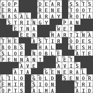 ACROSS 1. Grand Old Party 4. Letter starter 8. Fast planes 12. Period 13. French philosopher Descartes 14. A blast of a horn 15. Rhinal 18. Like ___ of sunshine 19. Round or rotation of duties 20. Slender, wiry 22. Baking dish 23. Inactive volcano in Sicily 24. Soggy 25. Car or cant ending 26. Chrissie's court nemesis 30. Definite Article 33. Moving about 36. Lyric poems 37. Moves up and down 39. Actor Linden 40. Delicate 41. _ gin 42. Having high moral qualities 44. Had dinner 45. Pre-World Series prize 47. Allow 50. "___ Maria" 51. Opinion 53. "One Day ___ Time" 54. Commissioned military rank 57. _ and Stitch 59. Precious metal 61. Sir (Sp.) 63. Independent ruler or chieftain 64. The Jewish people; Israel 65. Three (prefix) 66. Elects 67. _ mater 68. Help DOWN 1. Commissioned mil. rank 2. Mouths or openings 3. Thick mixture 4. To draw with force 5. Suggestive of the supernatural 6. Santa ___, CA 7. Marina Del _, California 8. Ski resort town in Vermont 9. Within a short period 10. Small child 11. R.R. building 16. Johnson of "Laugh-In" 17. Actor's bit 21. Nanny 22. For each 24. Armed conflict 26. Place where flour is made 27. It may be bright or harebrained 28. Egg locale 29. American tennis player Robert 30. Cook's measure (abbr.) 31. Opening into or through something 32. Inky black, to poets 34. Attempt 35. Keyboard key 38. Elected representatives 42. Compass dir. 43. Flair 46. Actress Gardner 48. Nights before holidays 49. Hoop that covers a wheel 52. Before Barbara or Clara 53. Came down and settled, as after flight 54. Take by theft 55. Pulitzer Prize-winning author Ferber 56. Australian parrot (variant) 57. Lion 58. Mischievous child 59. Girls' org. (abbr.) 60. Lubricate 62. To free from